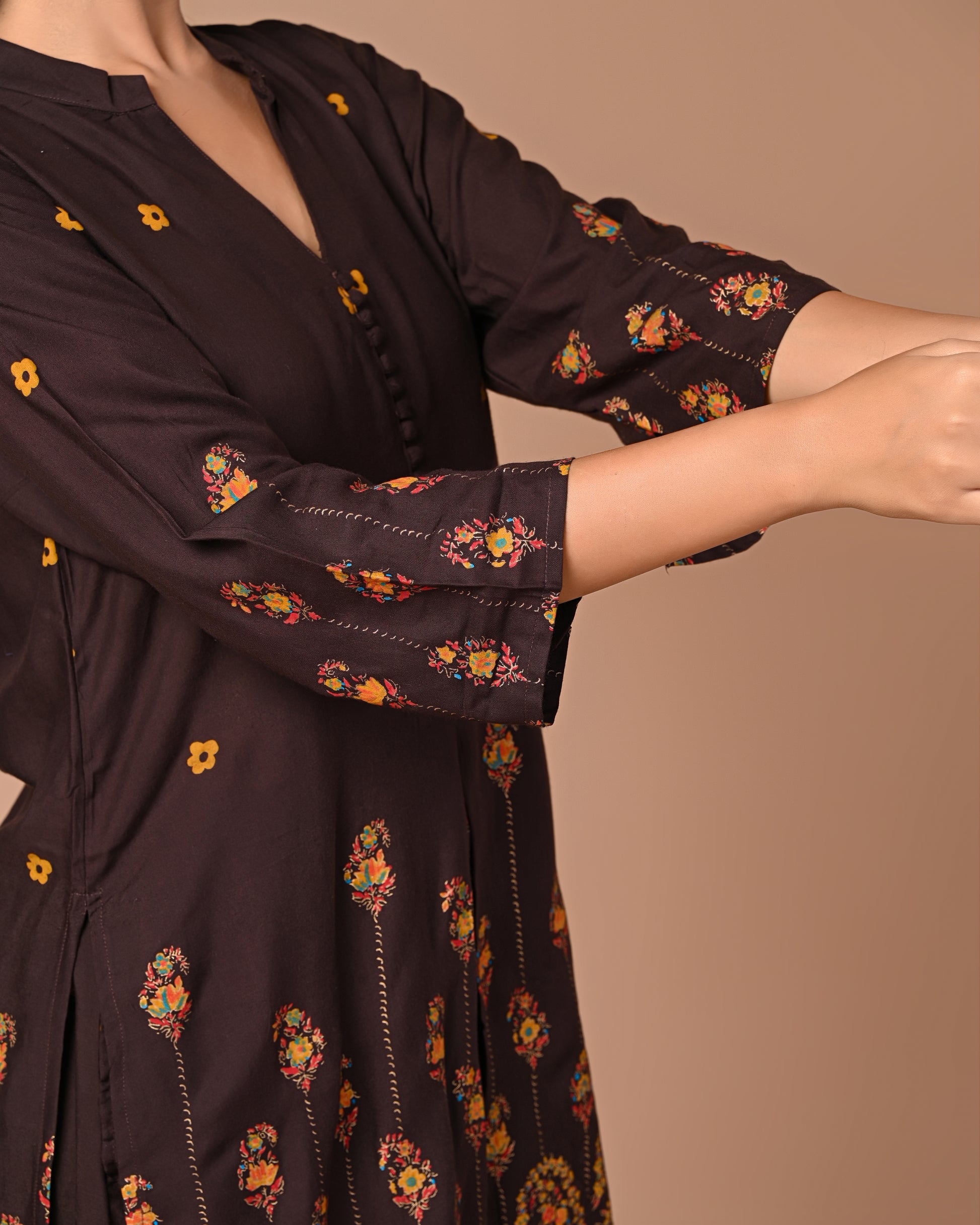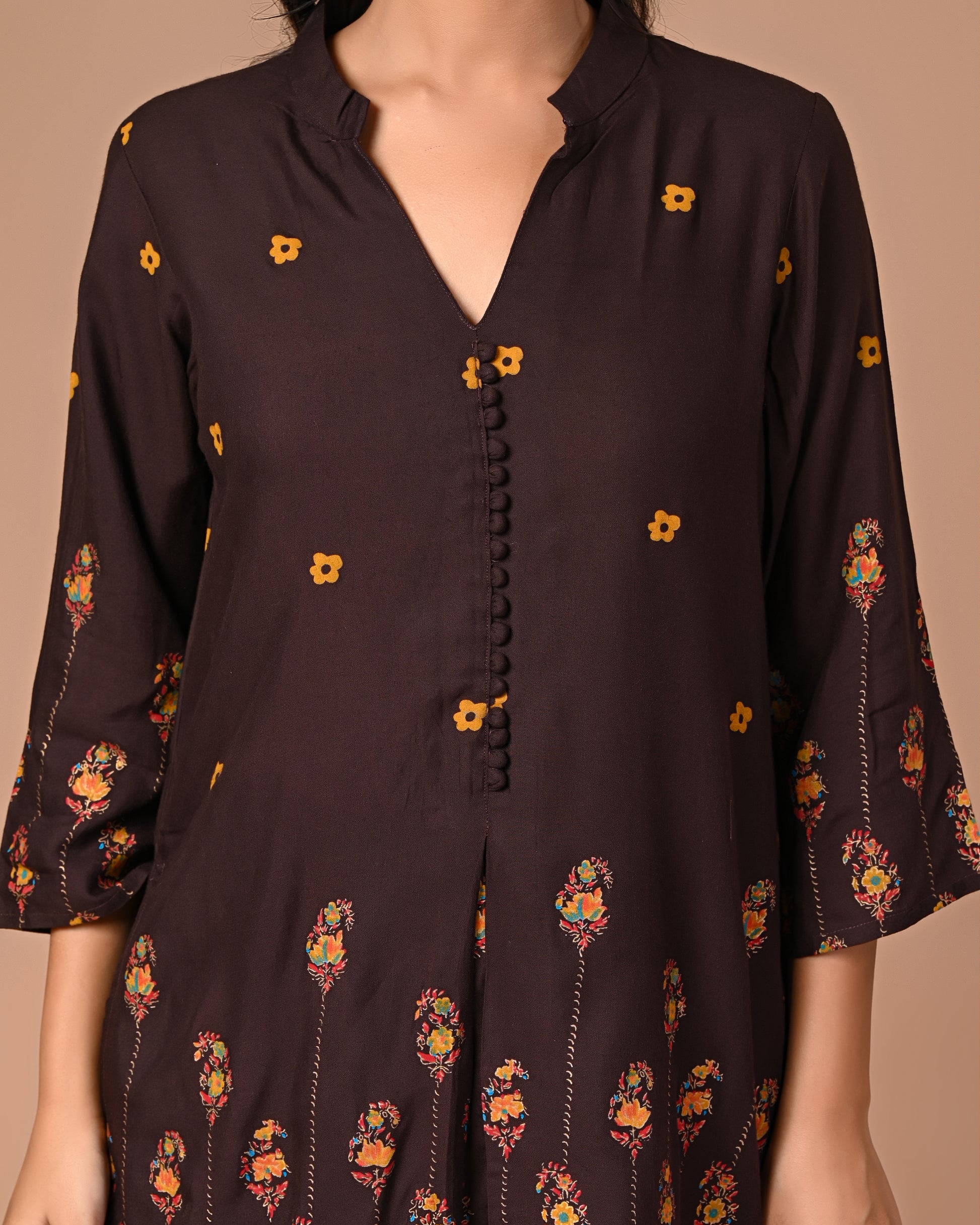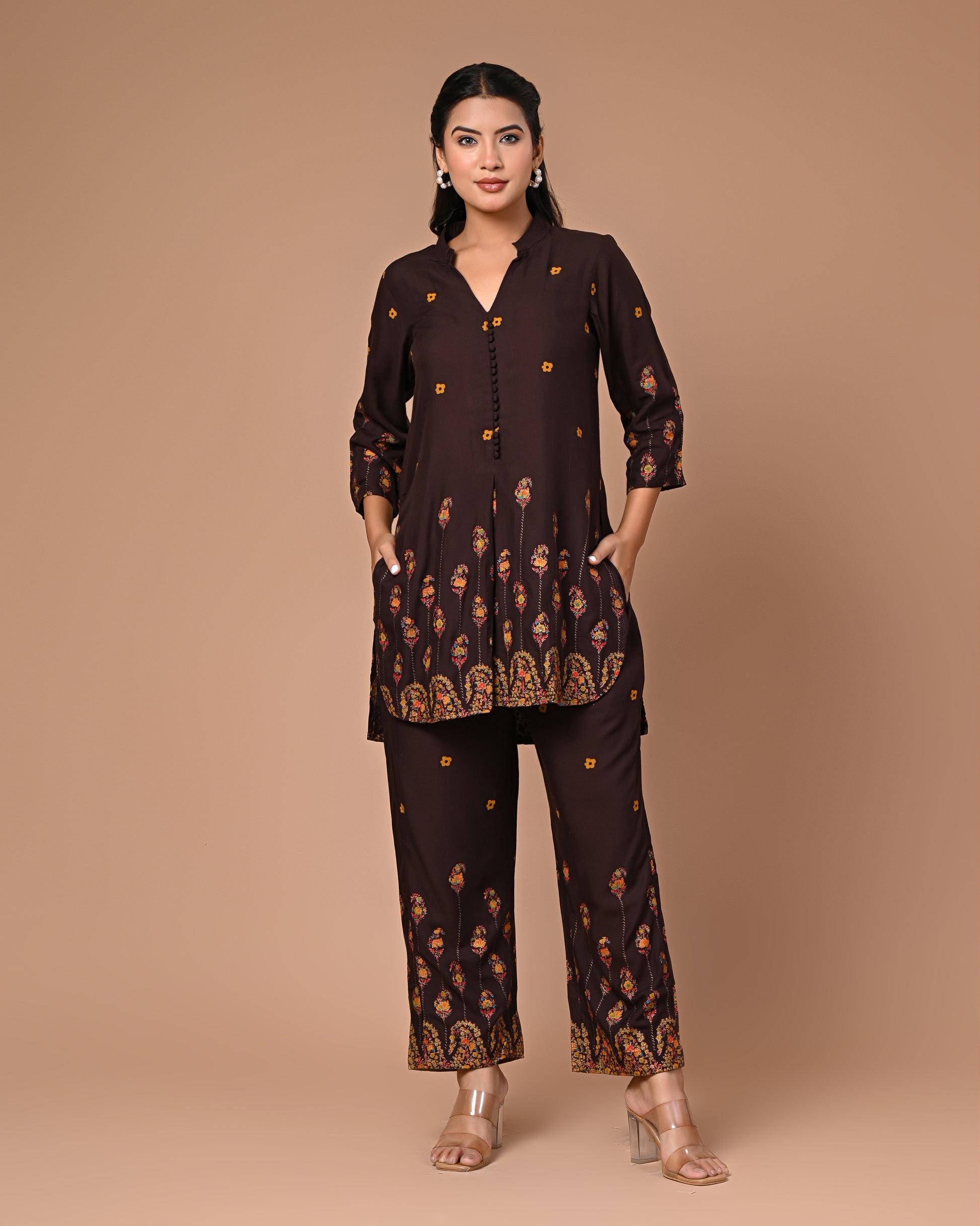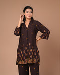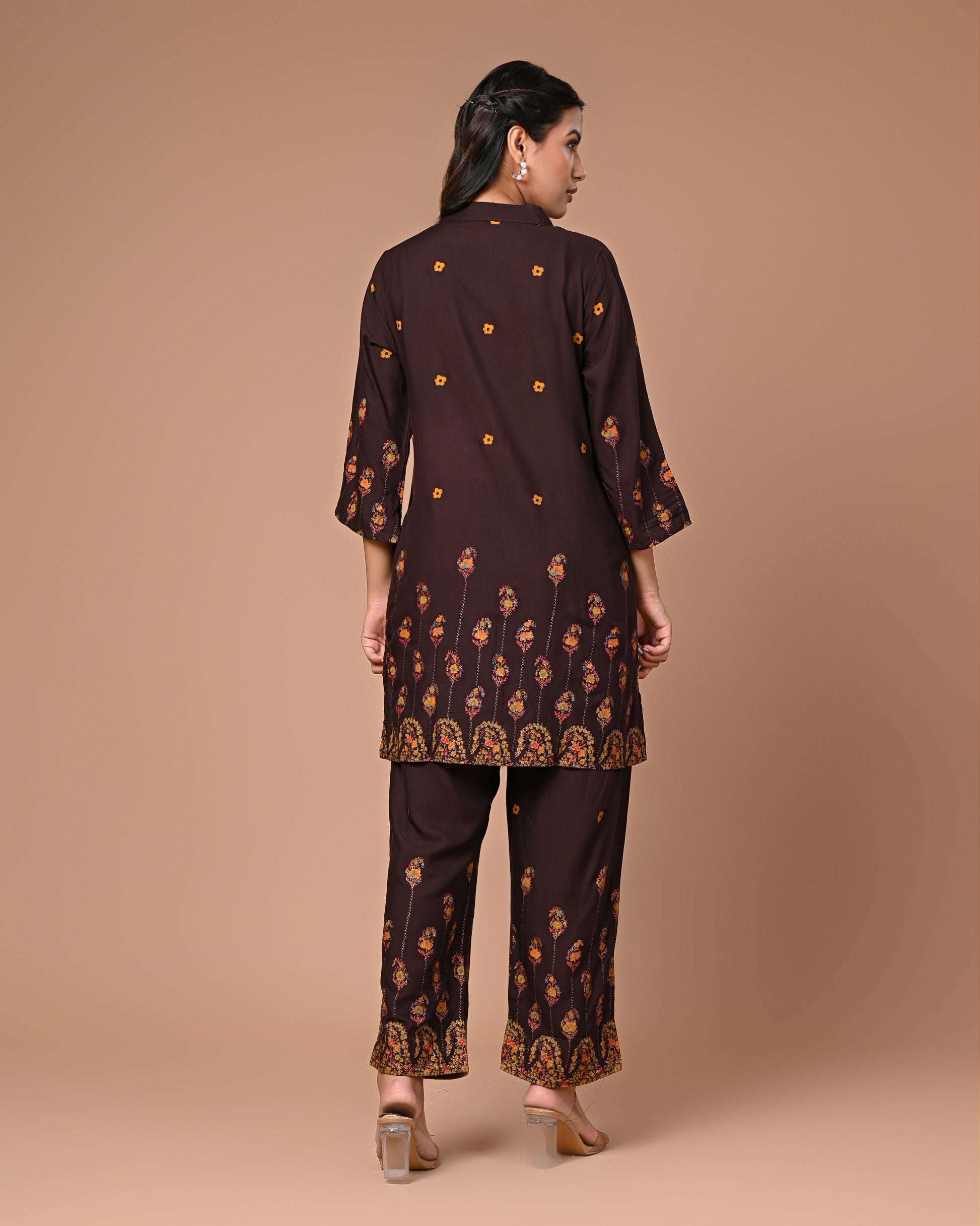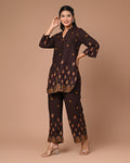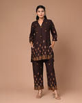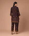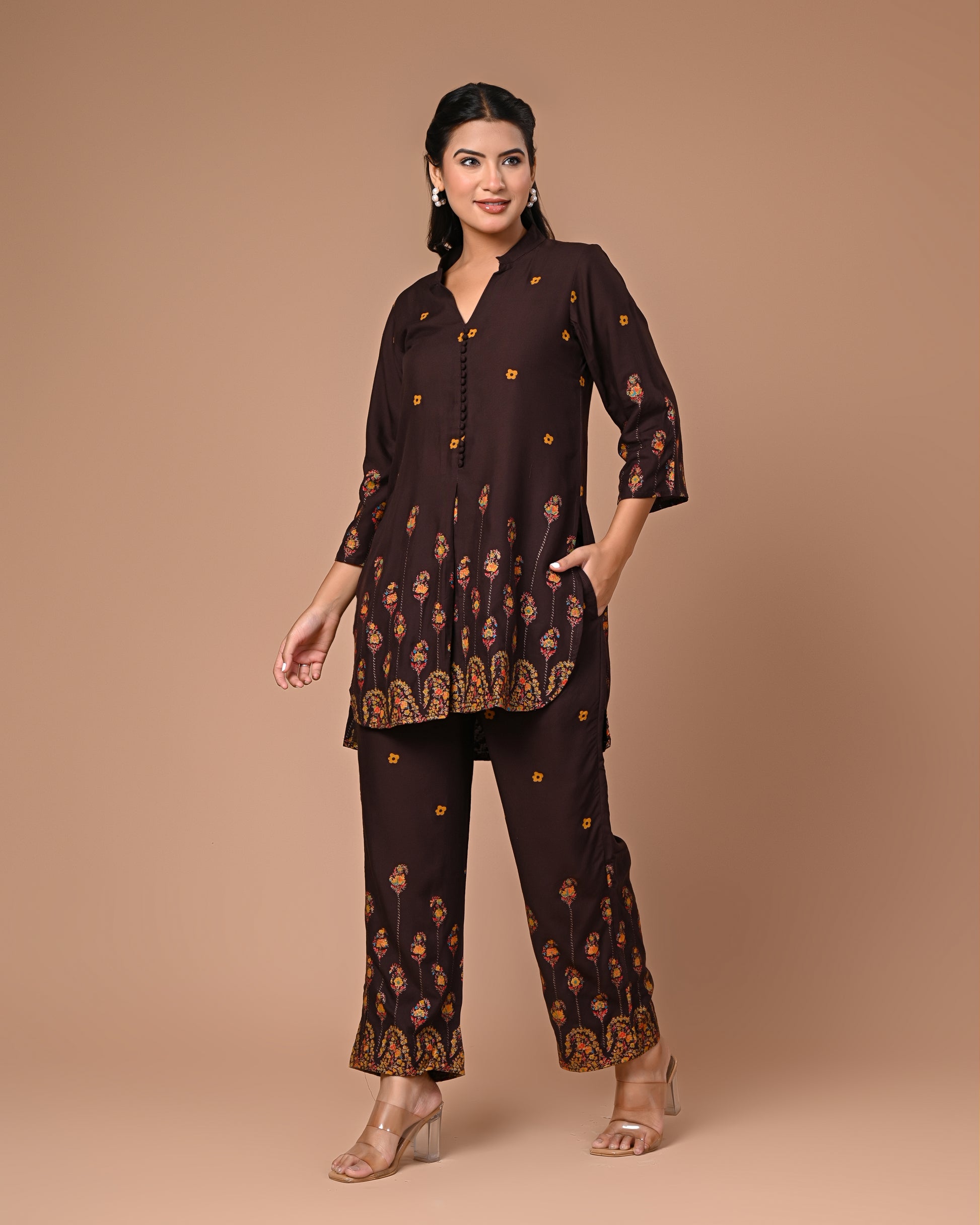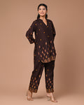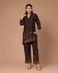 Cocoa foil-print co-ord set in a stunning shade, touched with a subtle shimmer that makes you dazzle this festive season. A versatile statement piece — perfect for parties, weddings, or intimate get-togethers. This unique co-ord brings elegance with a modern twist, ensuring all eyes are on you, wherever you go.