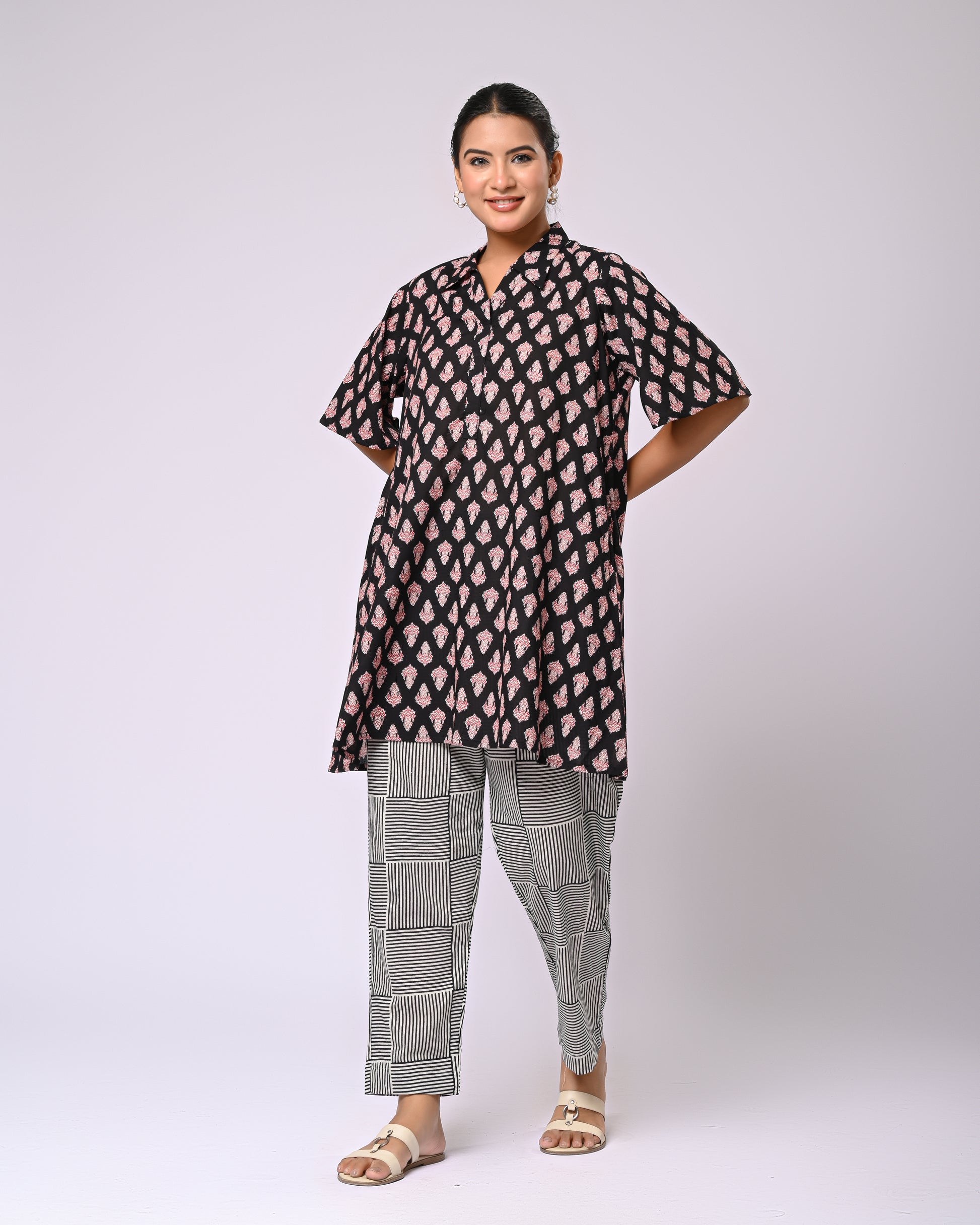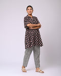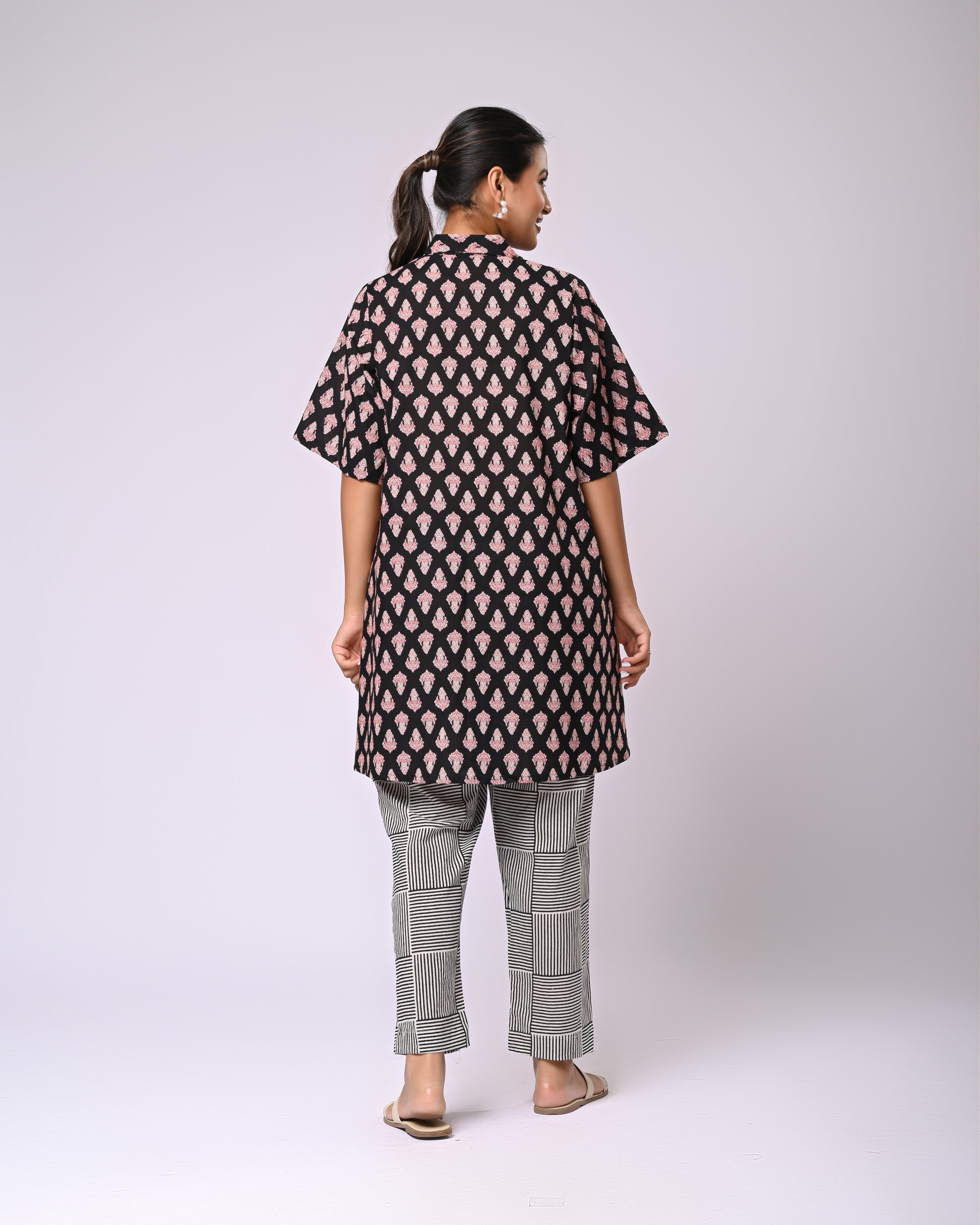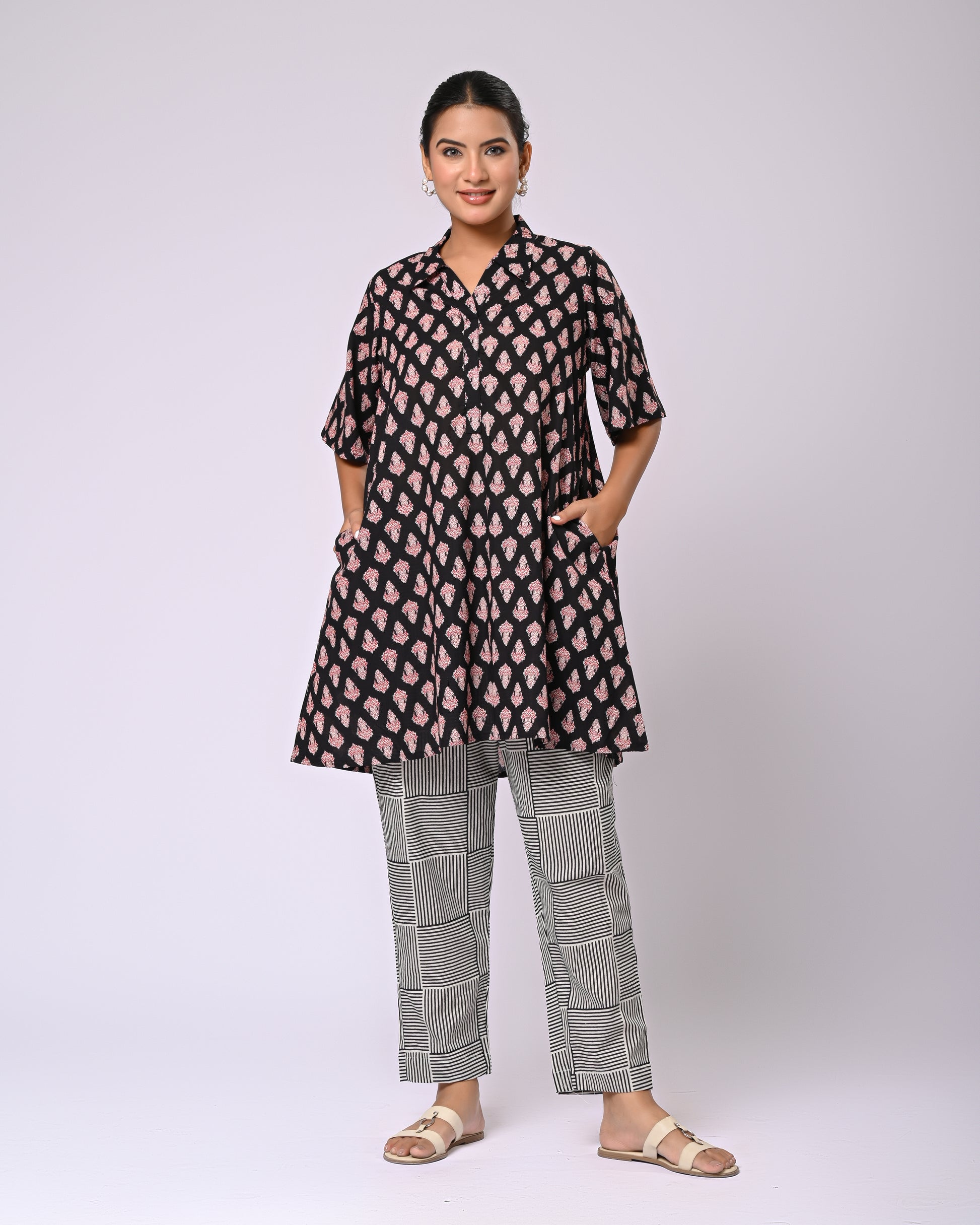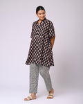 Effortless style meets playful detailing in the Firdaus Motif Co-Ord Set. The top features charming Siyahi motifs, paired perfectly with a checked bottom that includes functional pockets for a practical yet stylish touch. Crafted in soft cotton, this set offers all-day comfort while keeping your look crisp and put-together. Ideal for a casual day out, brunch, or even a relaxed office vibe, itโs a set that combines elegance with everyday ease.