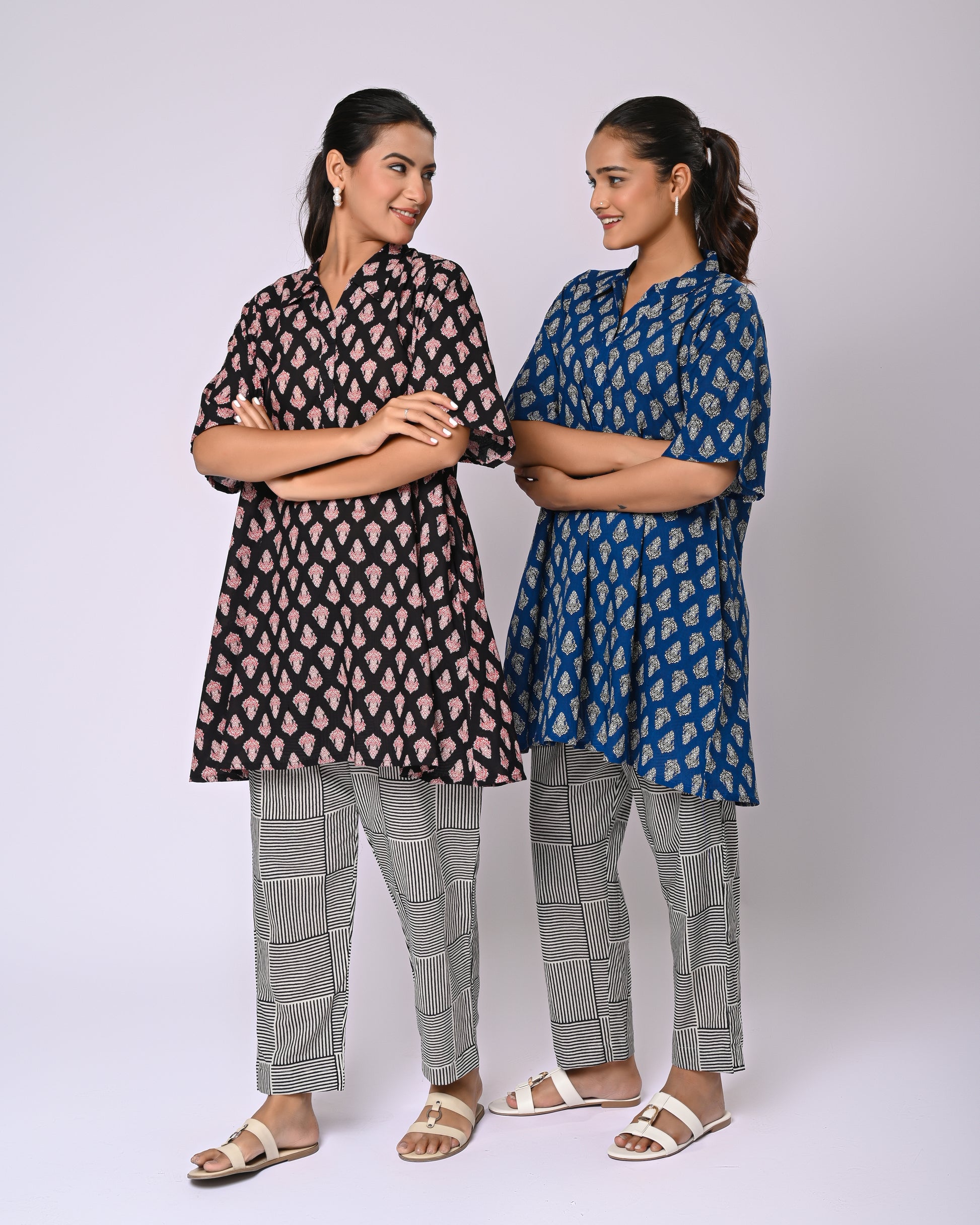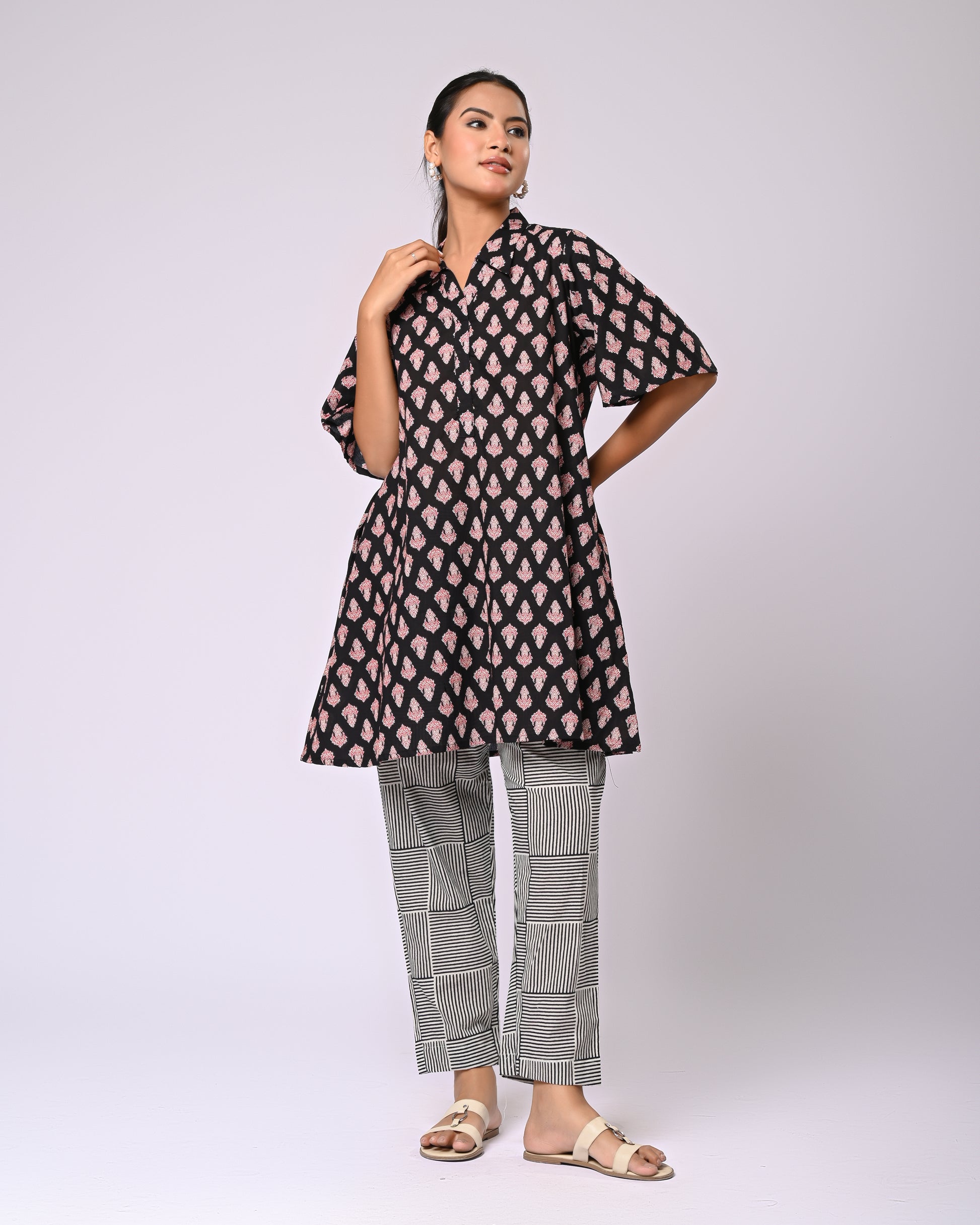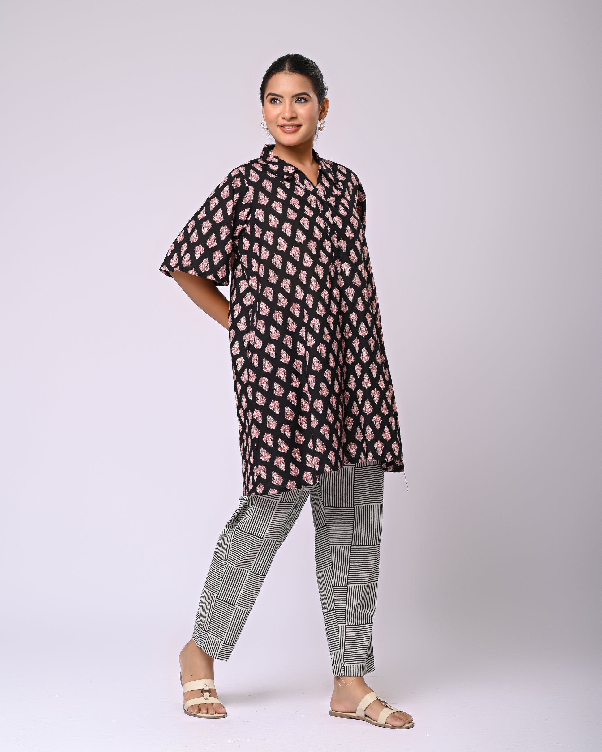 Effortless style meets playful detailing in the Firdaus Motif Co-Ord Set. The top features charming Siyahi motifs, paired perfectly with a checked bottom that includes functional pockets for a practical yet stylish touch. Crafted in soft cotton, this set offers all-day comfort while keeping your look crisp and put-together. Ideal for a casual day out, brunch, or even a relaxed office vibe, itโs a set that combines elegance with everyday ease.