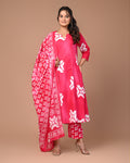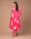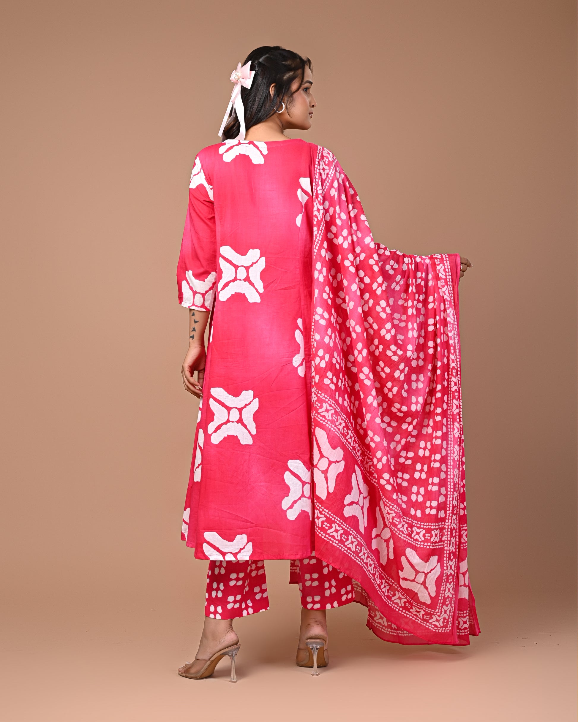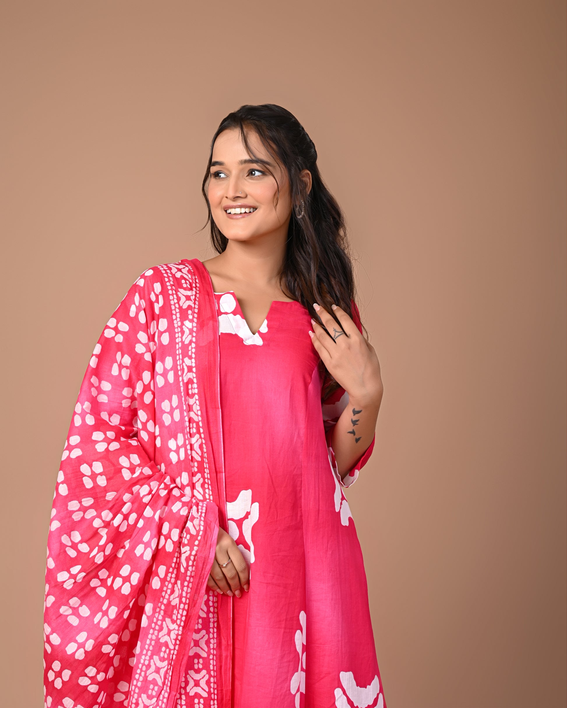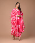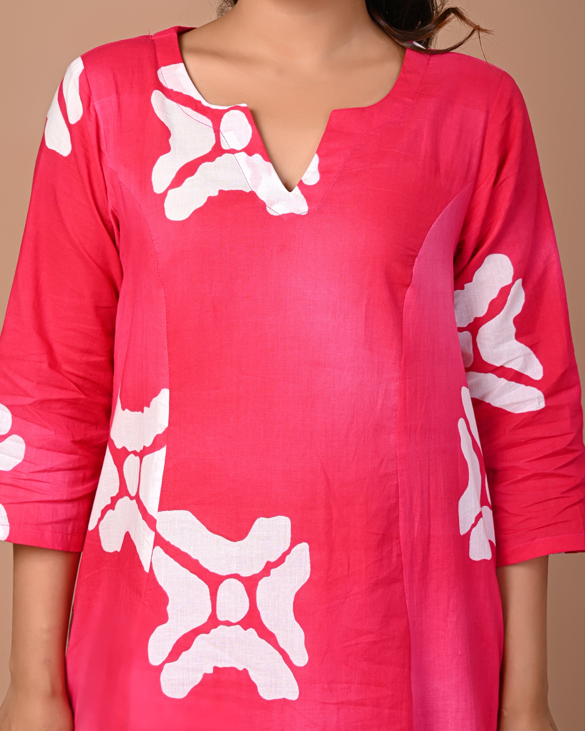 Embrace elegance and comfort with this pink cotton suit set, featuring a stunning geometric square print. The soft, breathable fabric feels gentle on your skin, while the A-line kurta flatters every body type. Perfectly tailored to fit and drape gracefully, this set combines effortless style with everyday comfort, making it a wardrobe essential for every occasion.
