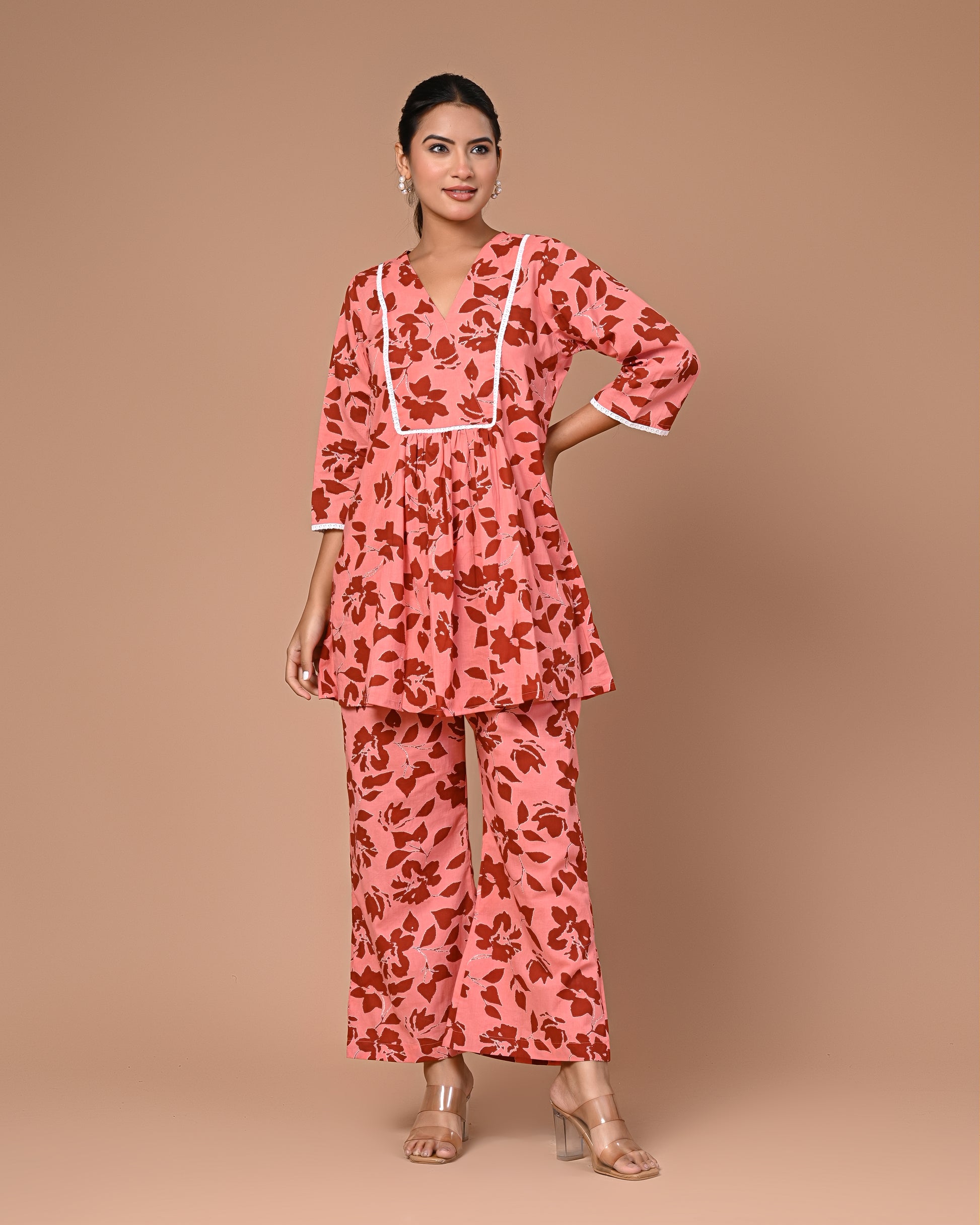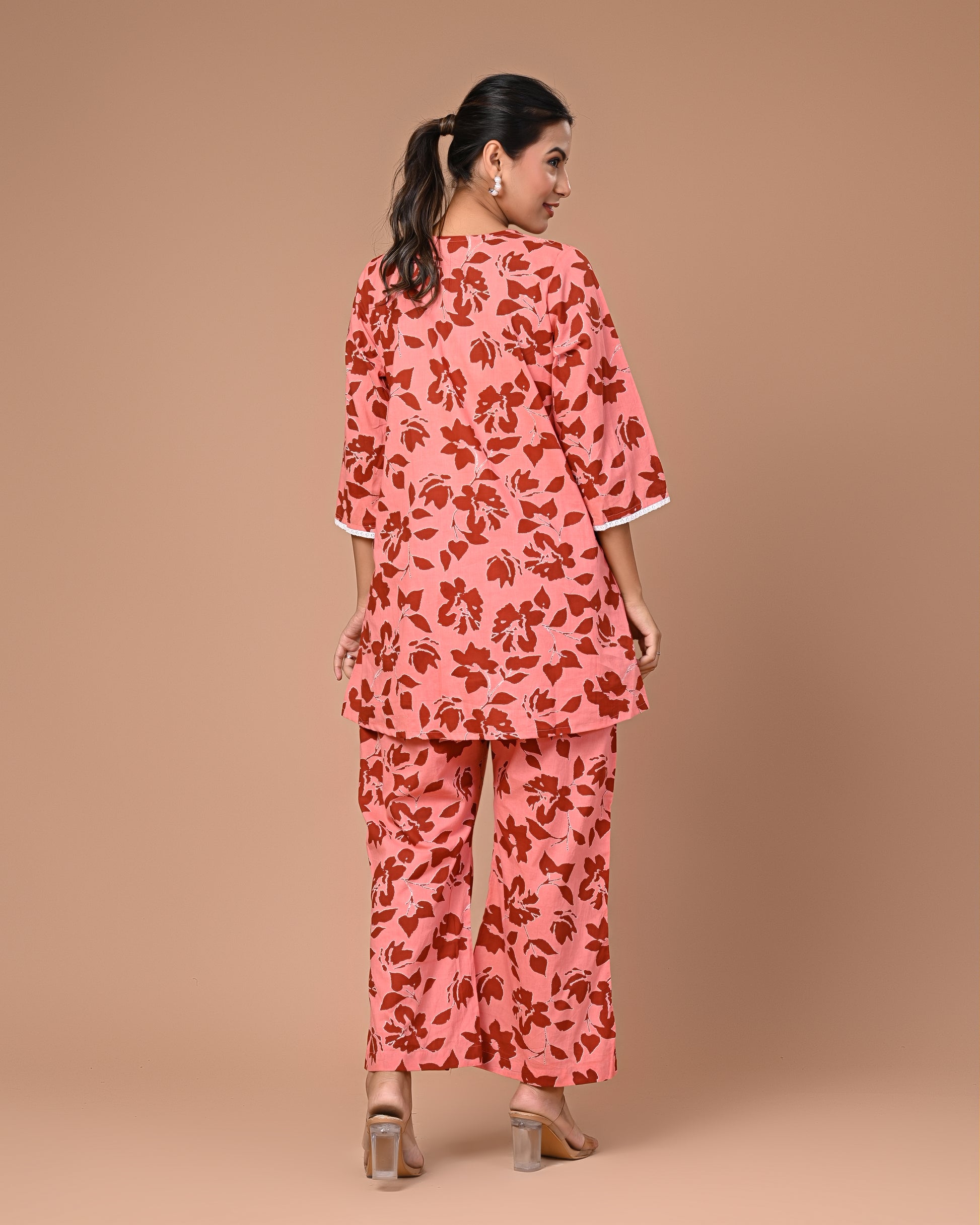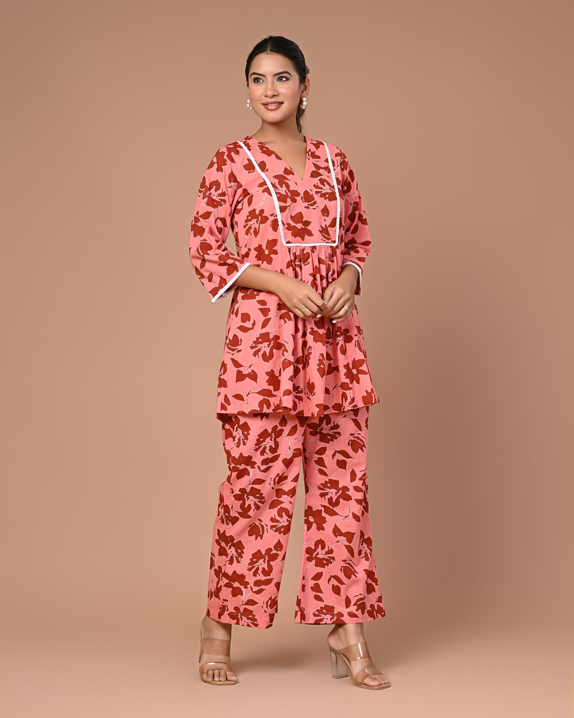 Step into effortless elegance with the Peach Blossom Co-ord Set, crafted in soft, breathable cotton for all-day comfort. The delicate white lace detailing adds a subtle charm, making this set perfect for a casual brunch, a girls’ day out, or a relaxed weekend look. The soft peach hue brings a fresh, radiant vibe, while the breezy fit ensures you stay comfortable without compromising on style. A perfect blend of comfort and sophistication for your everyday wardrobe.