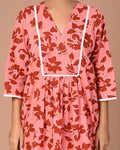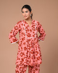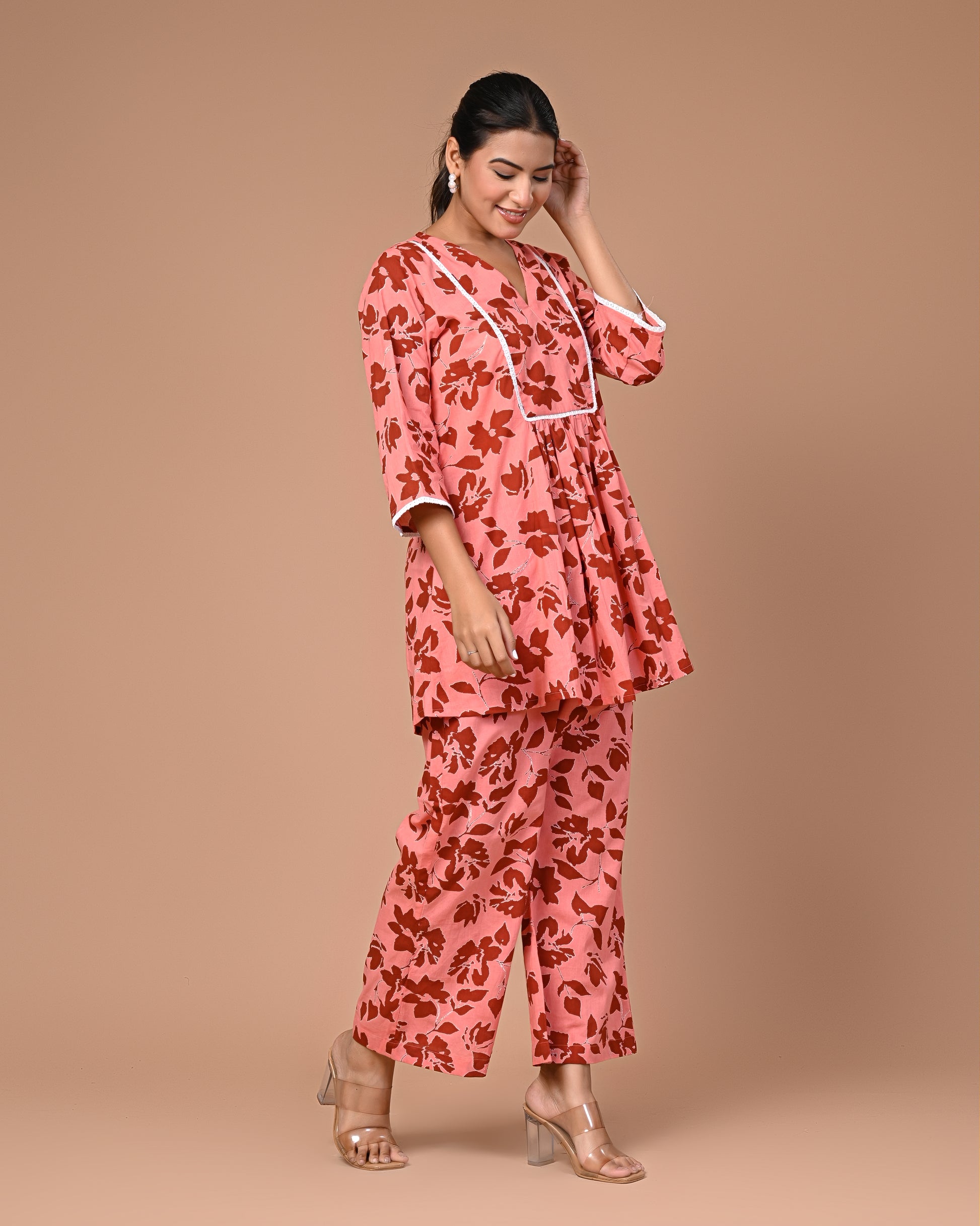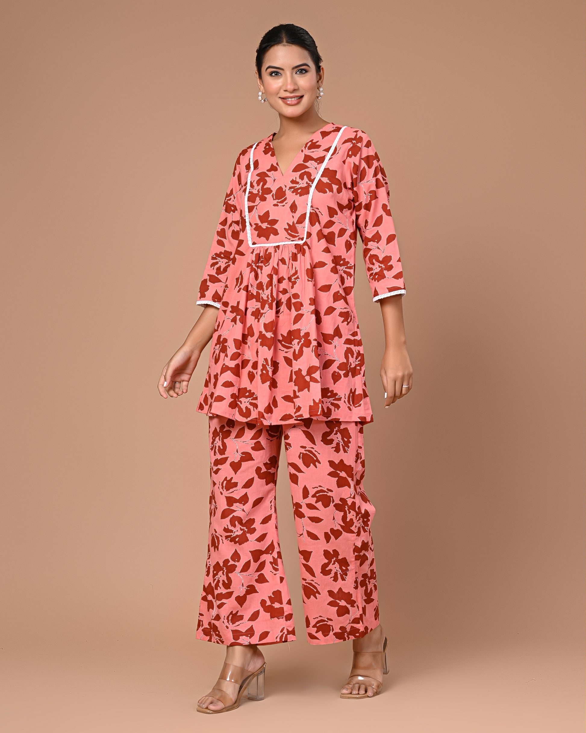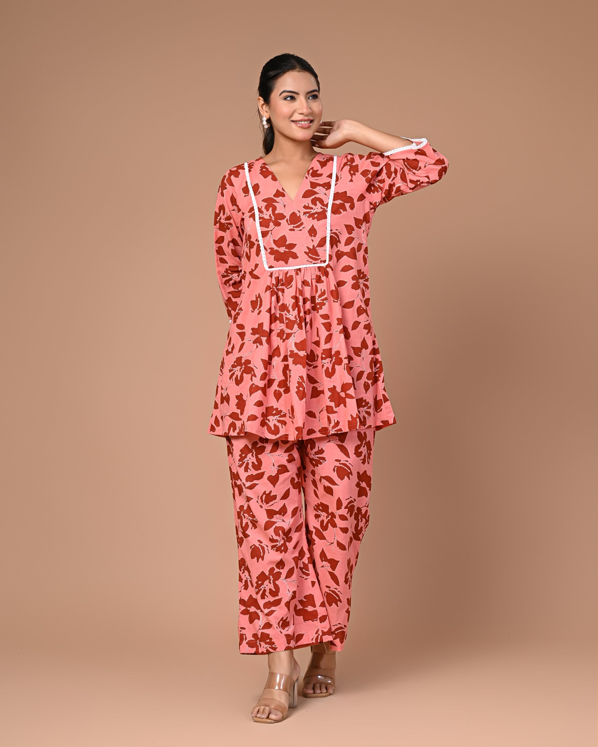 Step into effortless elegance with the Peach Blossom Co-ord Set, crafted in soft, breathable cotton for all-day comfort. The delicate white lace detailing adds a subtle charm, making this set perfect for a casual brunch, a girls’ day out, or a relaxed weekend look. The soft peach hue brings a fresh, radiant vibe, while the breezy fit ensures you stay comfortable without compromising on style. A perfect blend of comfort and sophistication for your everyday wardrobe.