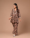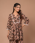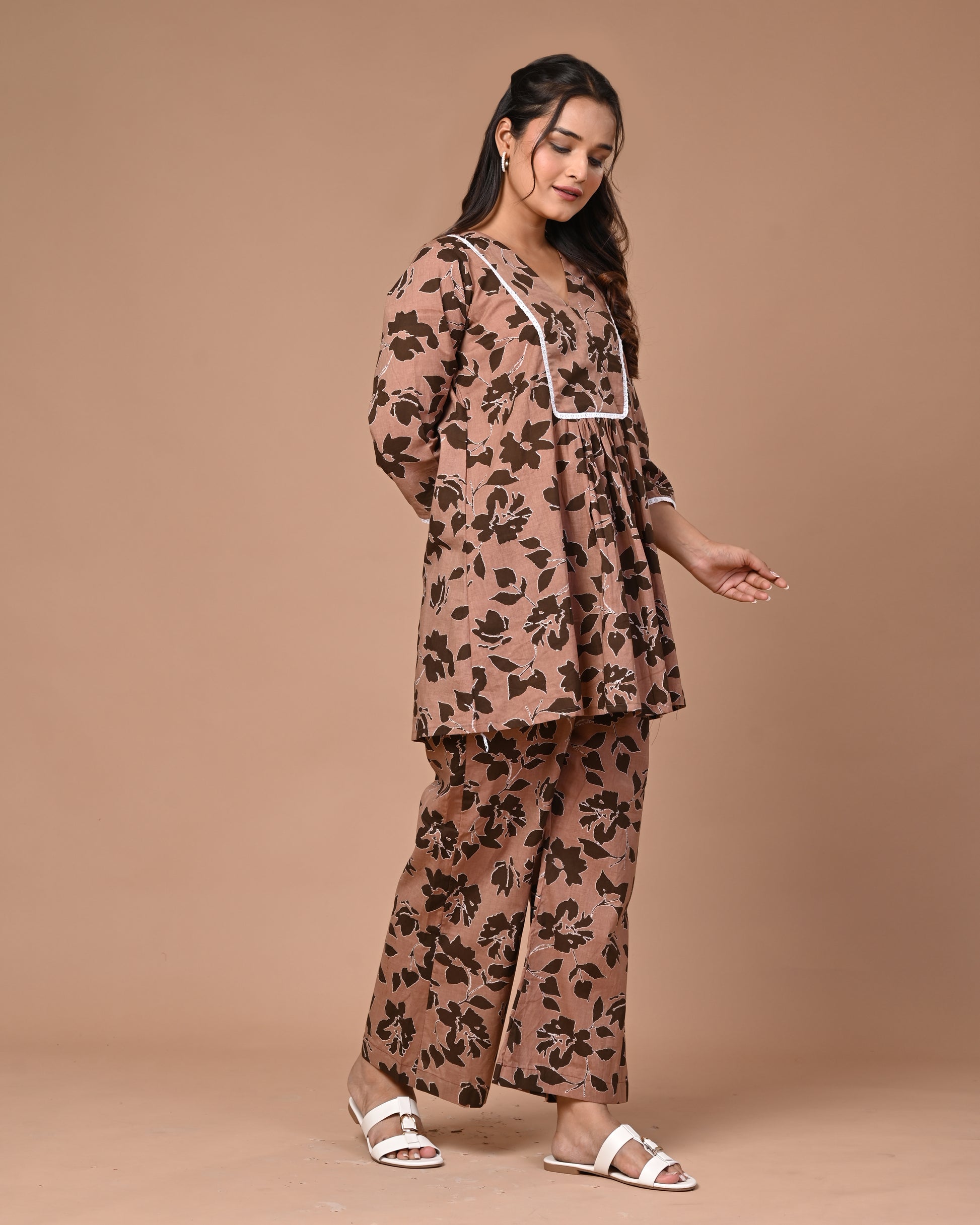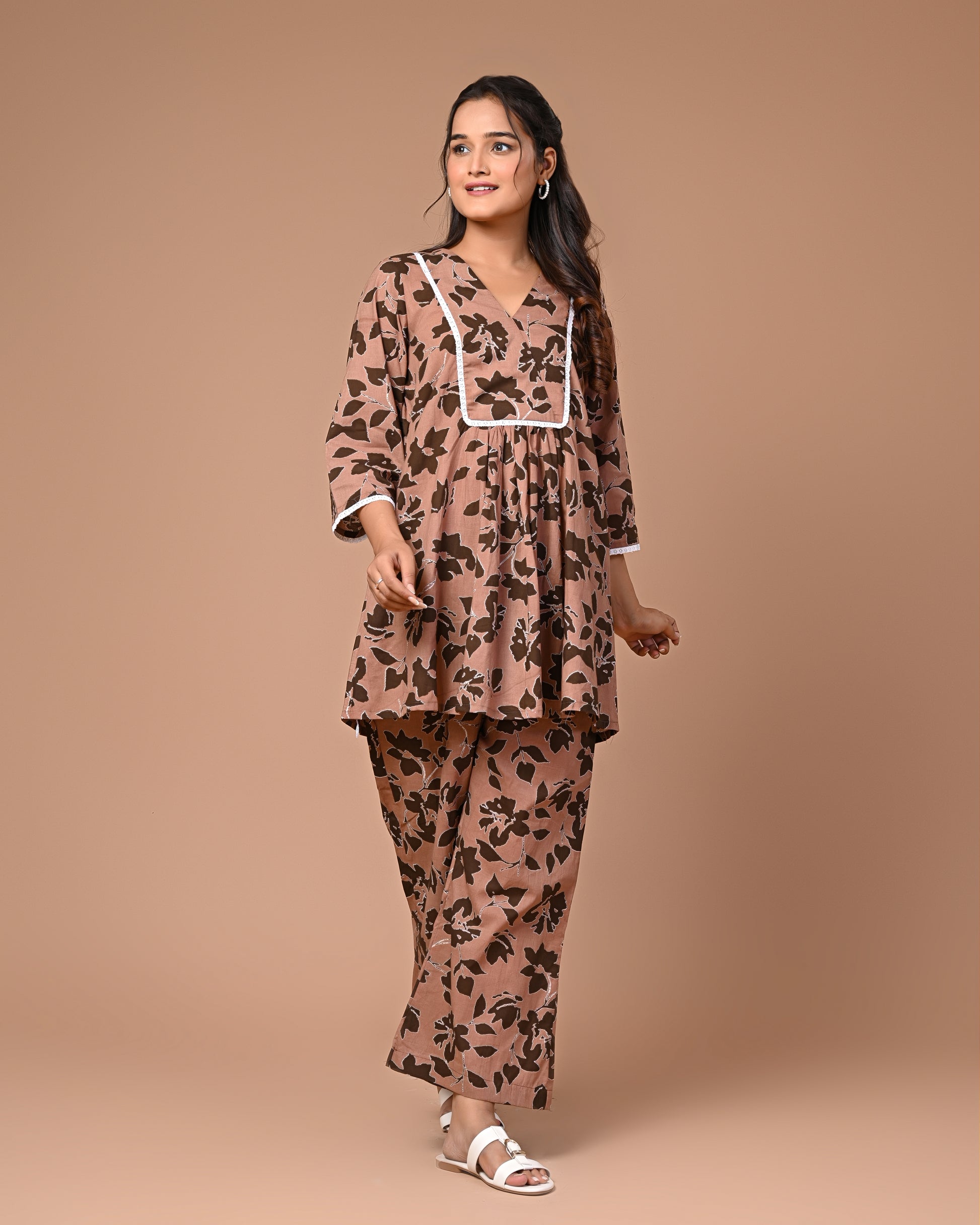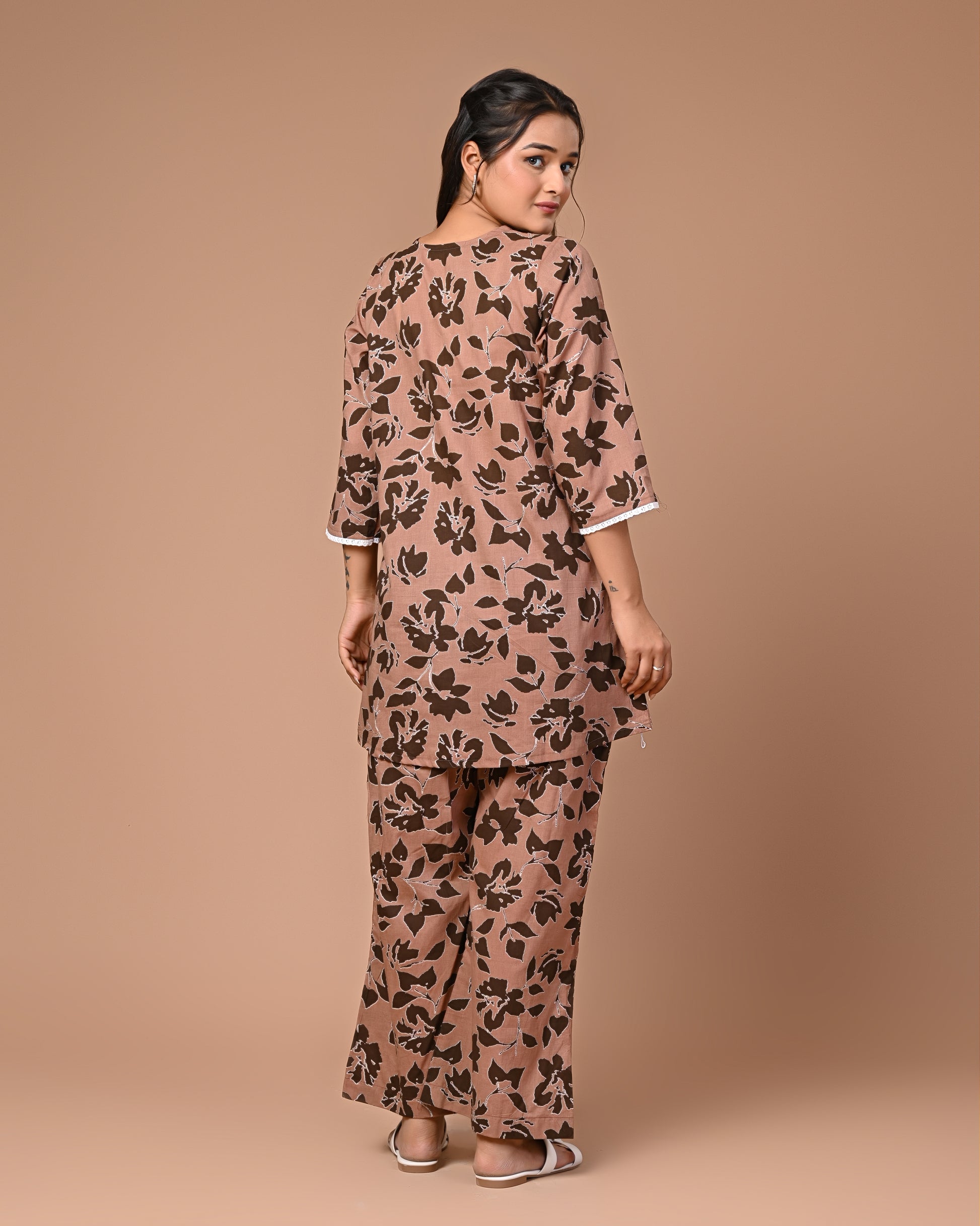 Embrace warmth and sophistication with the Maple Cocoa Co-ord Set. Made from soft cotton and adorned with delicate white lace, this rich brown hue adds a cozy, elegant touch to your style. Ideal for casual outings, gatherings, or festive occasions.