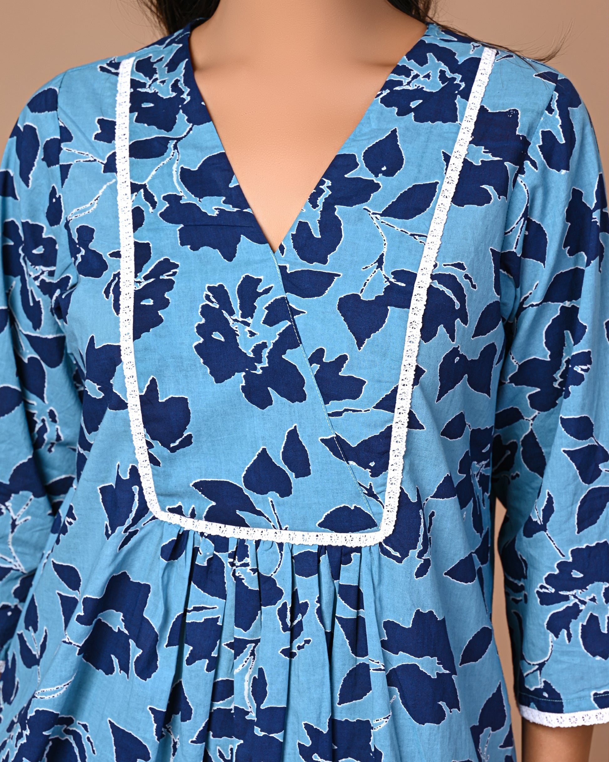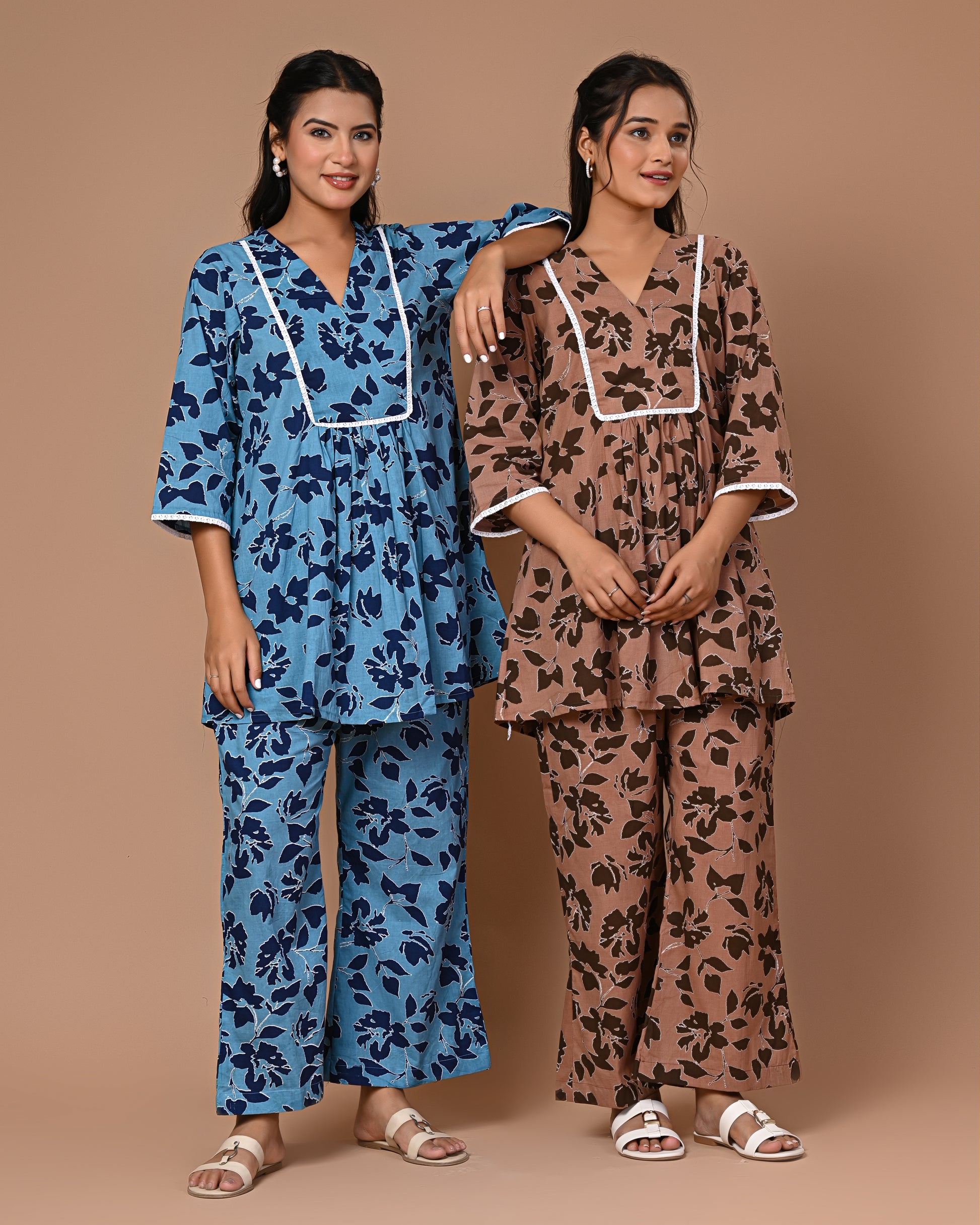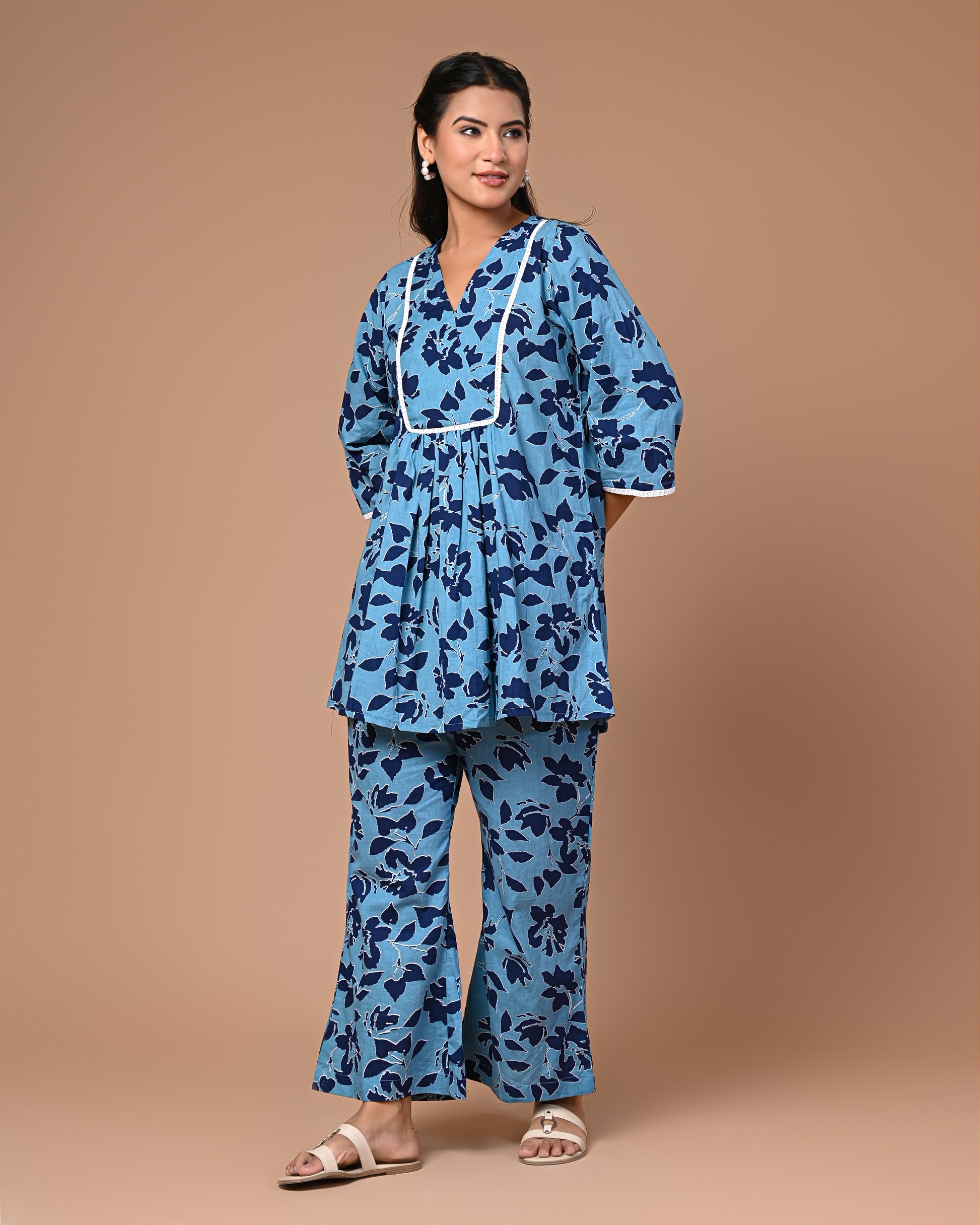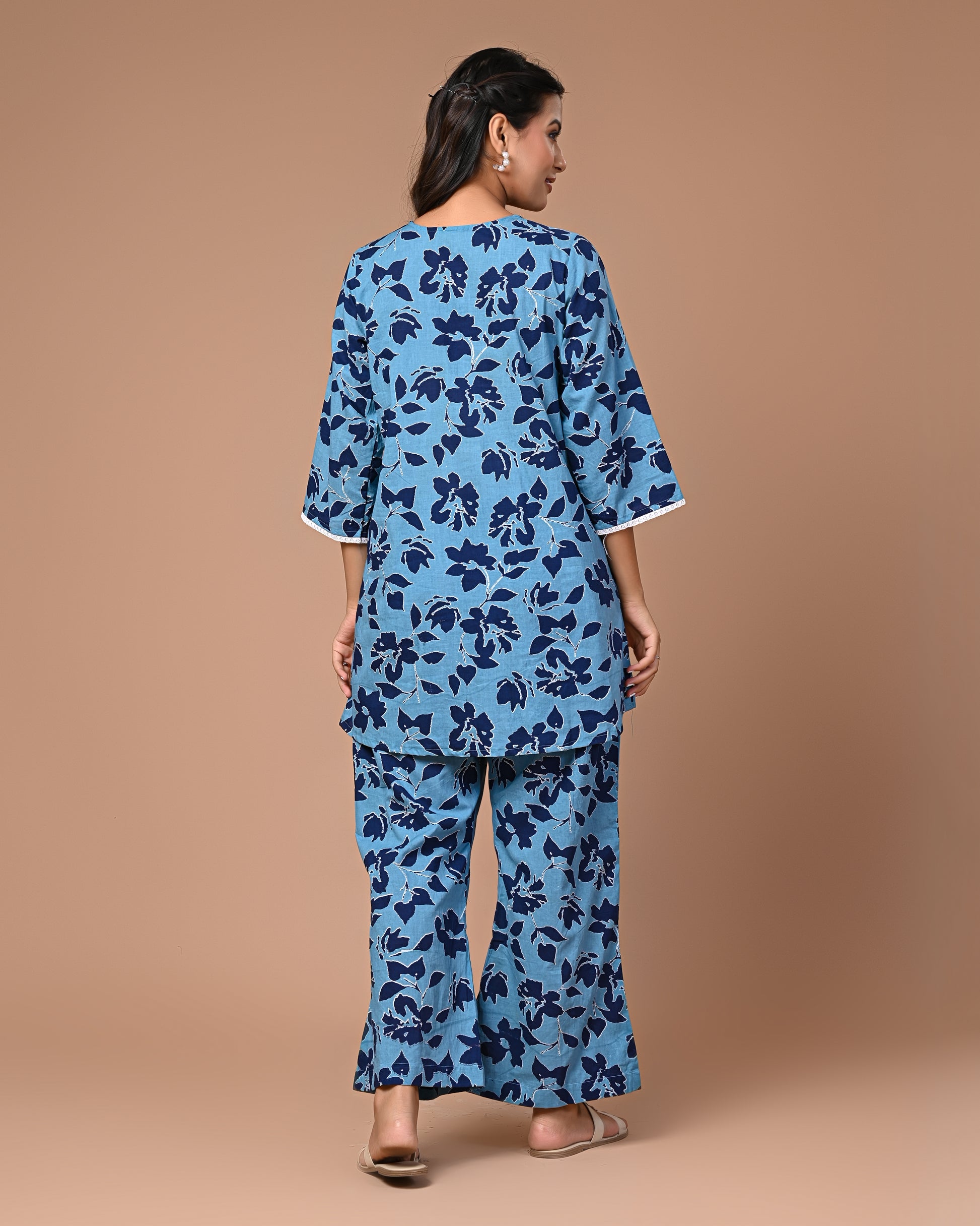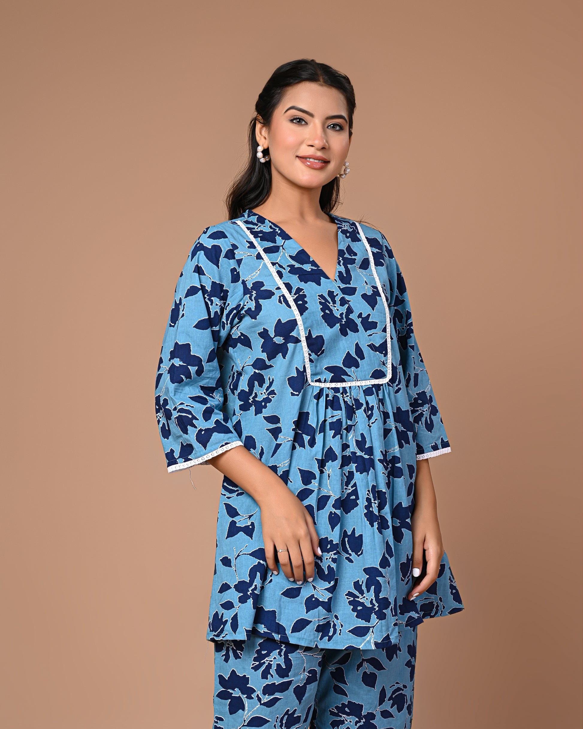 Step into effortless charm with the Maple Serenity Co-ord Set. Crafted in soft cotton with delicate white lace detailing, this soothing blue shade brings calm elegance to your everyday or festive wardrobe. Perfect for a chic, graceful look wherever you go.