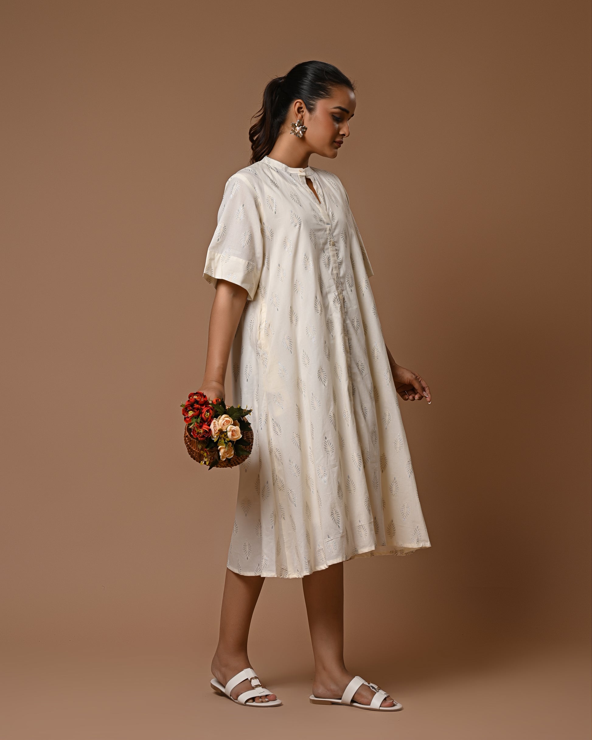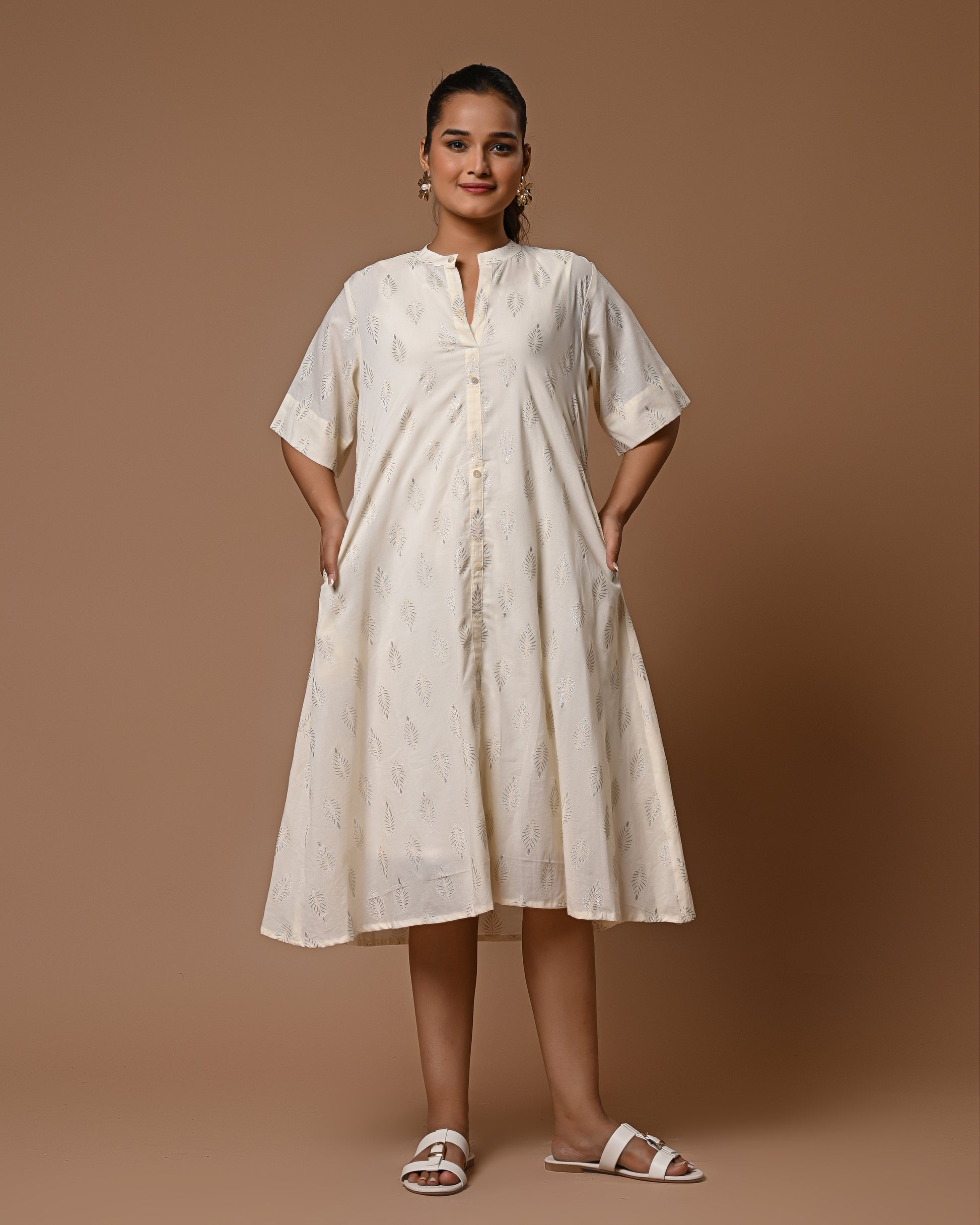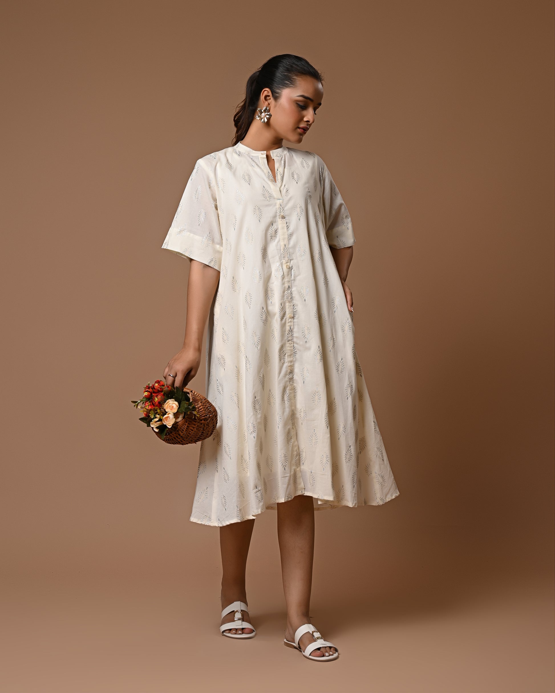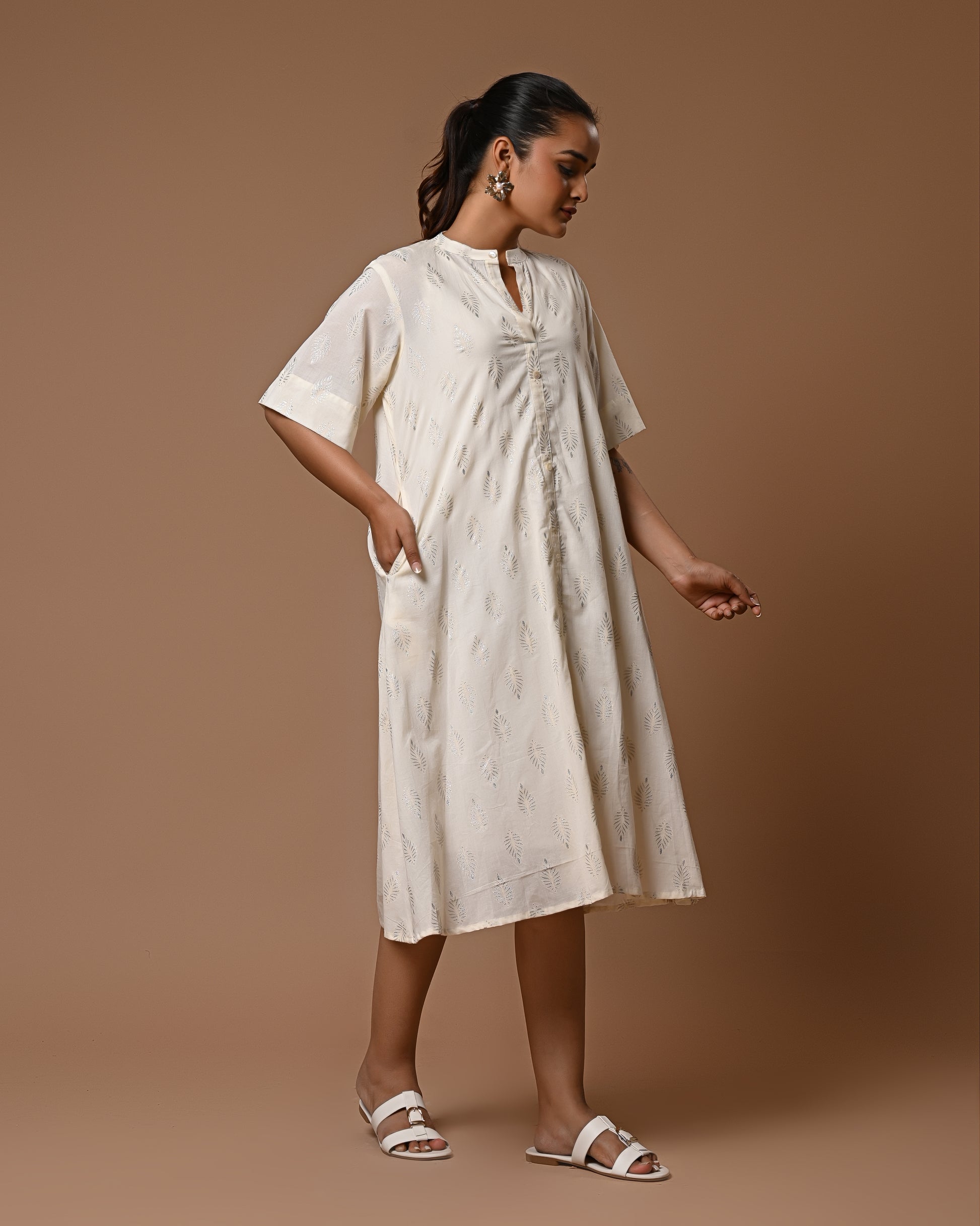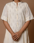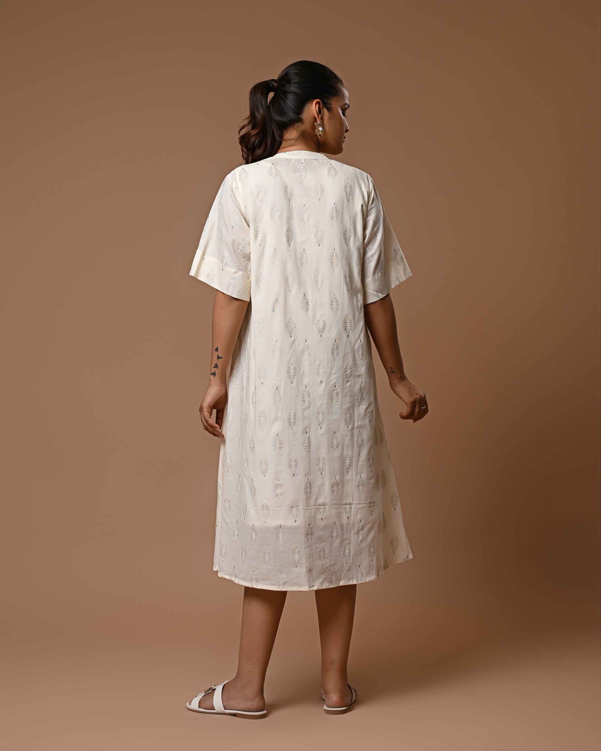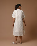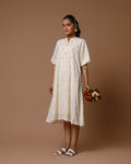 Shimmer with understated elegance in the Moonlit Drape Dress. Crafted in soft, airy cotton, this off-white dress is adorned with delicate silver motif prints that catch the light beautifully, giving a subtle sparkle to your look. Its relaxed fit ensures comfort while exuding effortless grace, making it perfect for brunches, casual outings, or a serene evening stroll. A timeless piece that blends simplicity with a touch of magic.