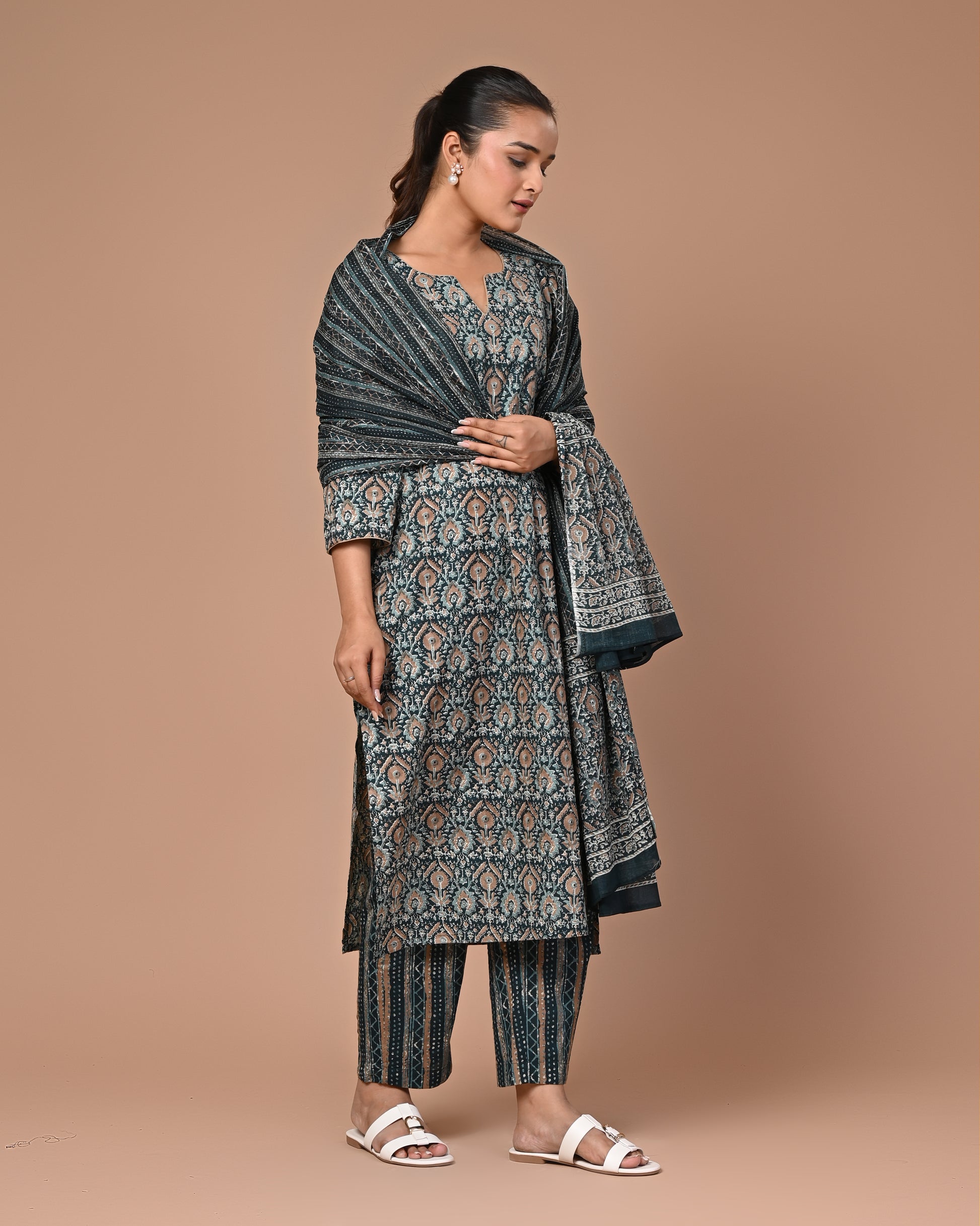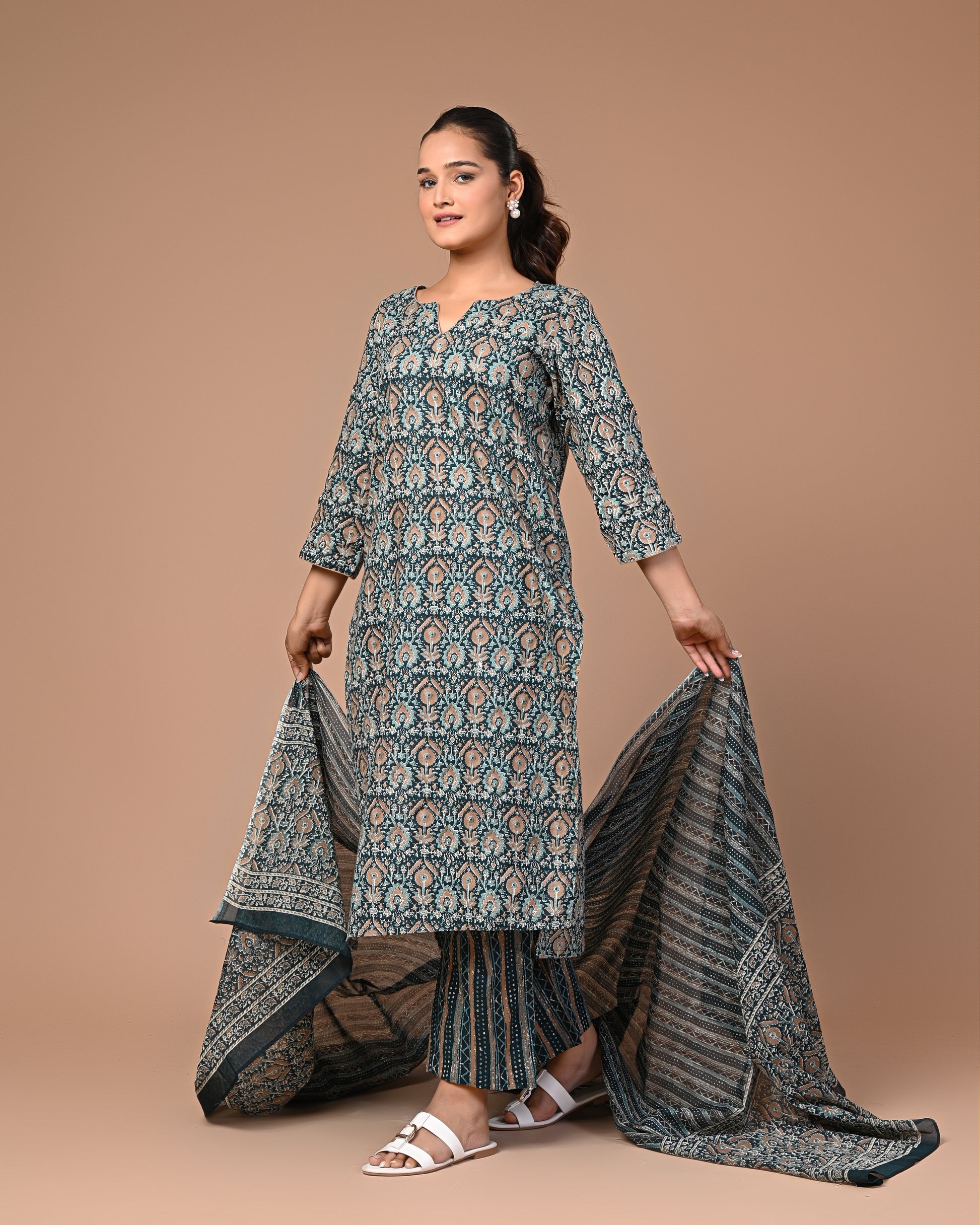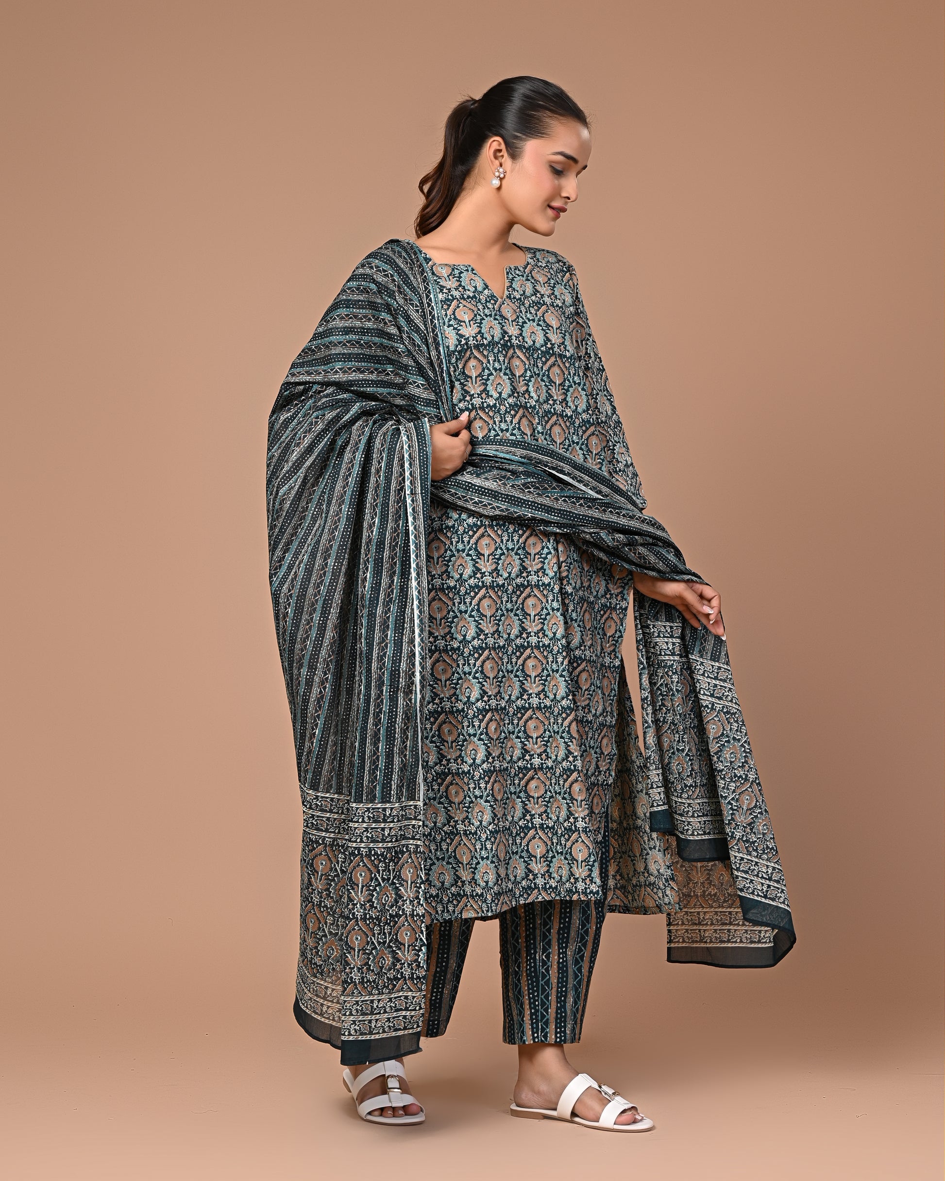 Bring a fresh, vibrant charm to your wardrobe with the Pista Delight Set in rich emerald green. Crafted in soft, breathable cotton, this set offers comfort without compromising on style. Its subtle elegance and lively shade make it perfect for casual outings, brunches, or festive day looks. A refreshing, standout piece that adds a touch of nature-inspired grace to your everyday ensemble.