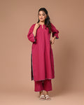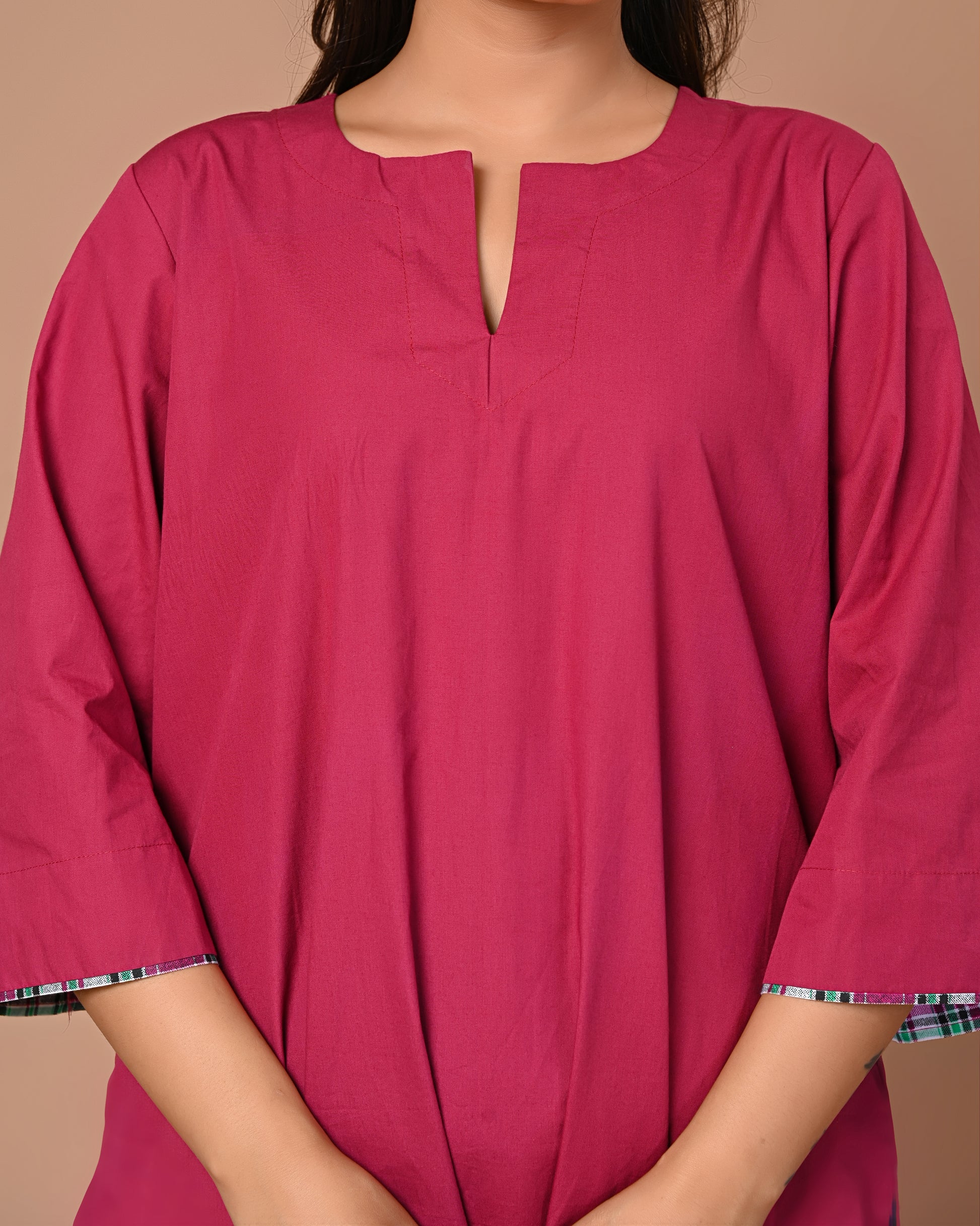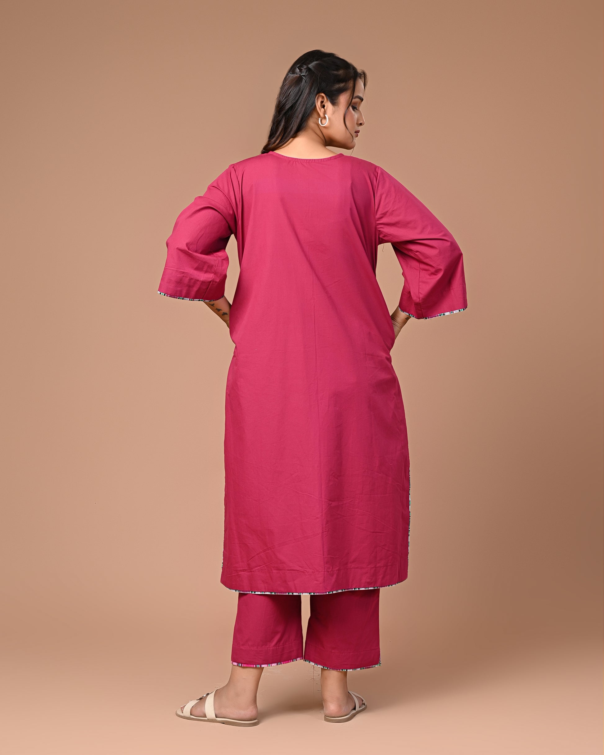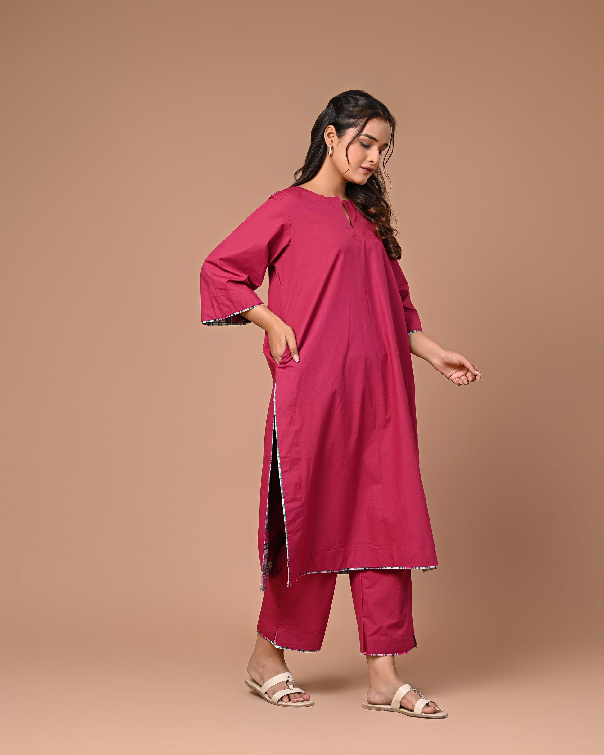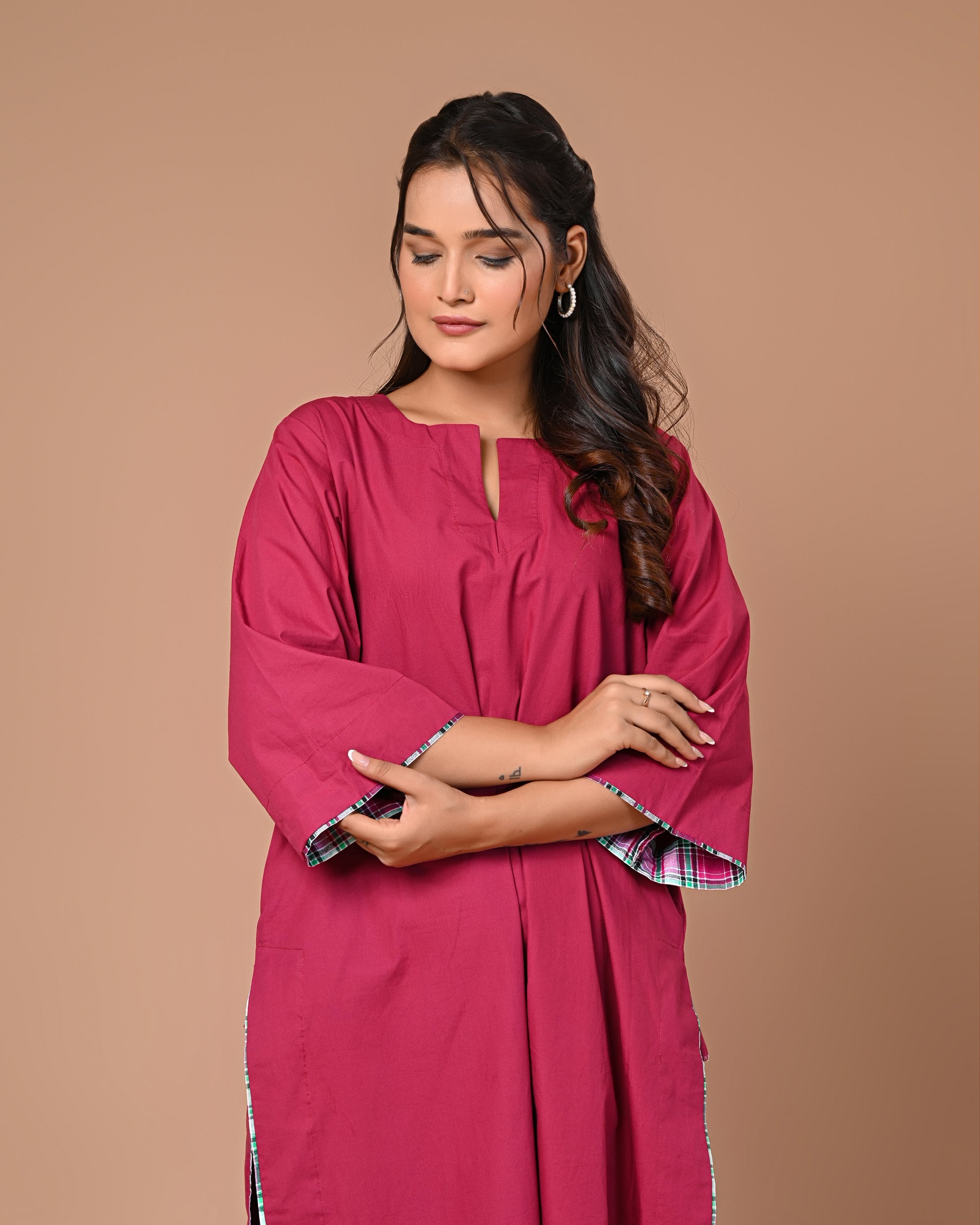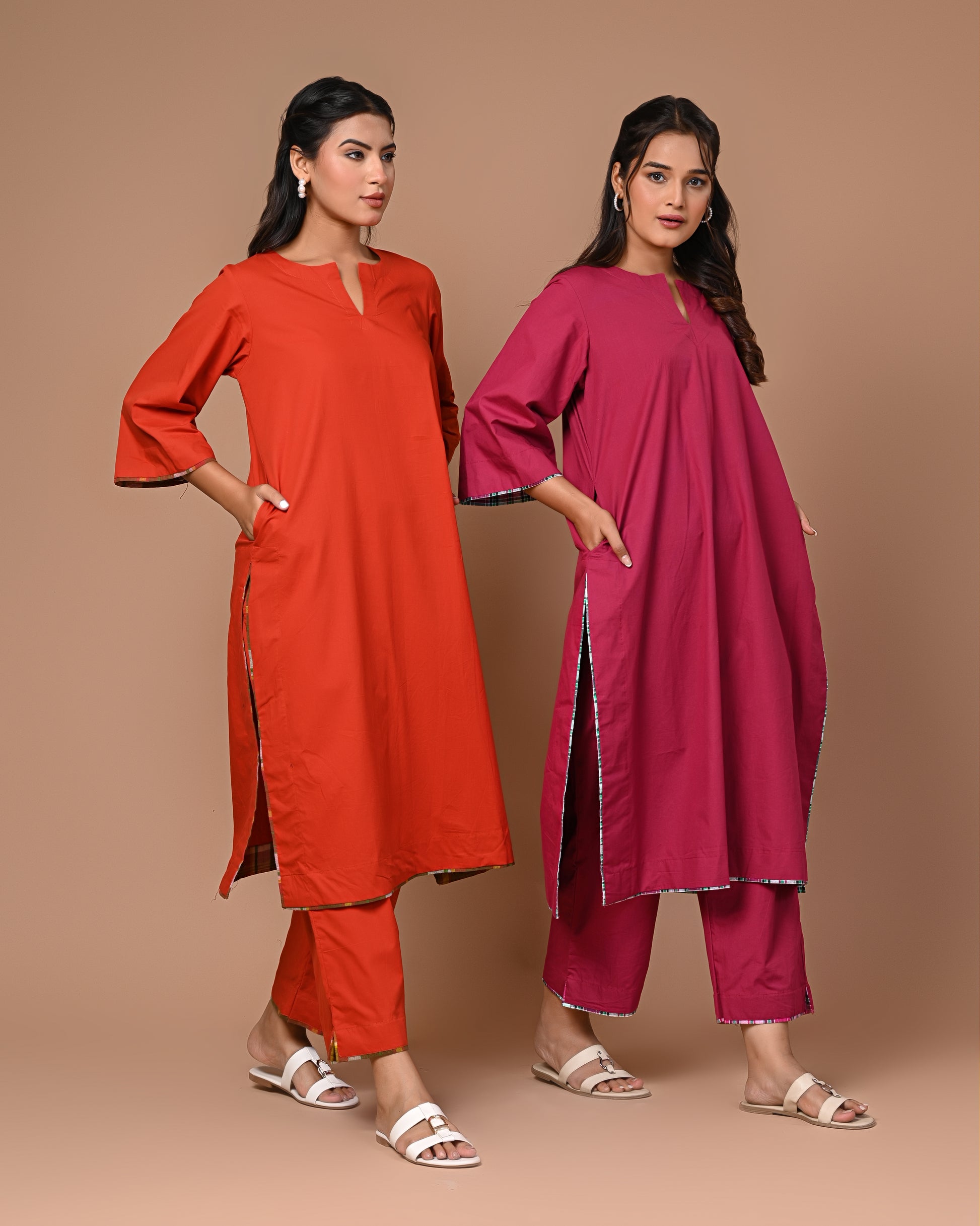 A cotton co-ord set in a bright shade, finished with delicate gingham detailing at the edges. Designed to bring together an ethnic yet modern vibe, it carries a hint of Kashmiri charm — soft, radiant, and effortlessly graceful. Perfect for the coming winter season, this loose kurta co-ord flows with ease and comfort. Style it with long oxidised earrings and a pair of mojadis for that chic, girly look.