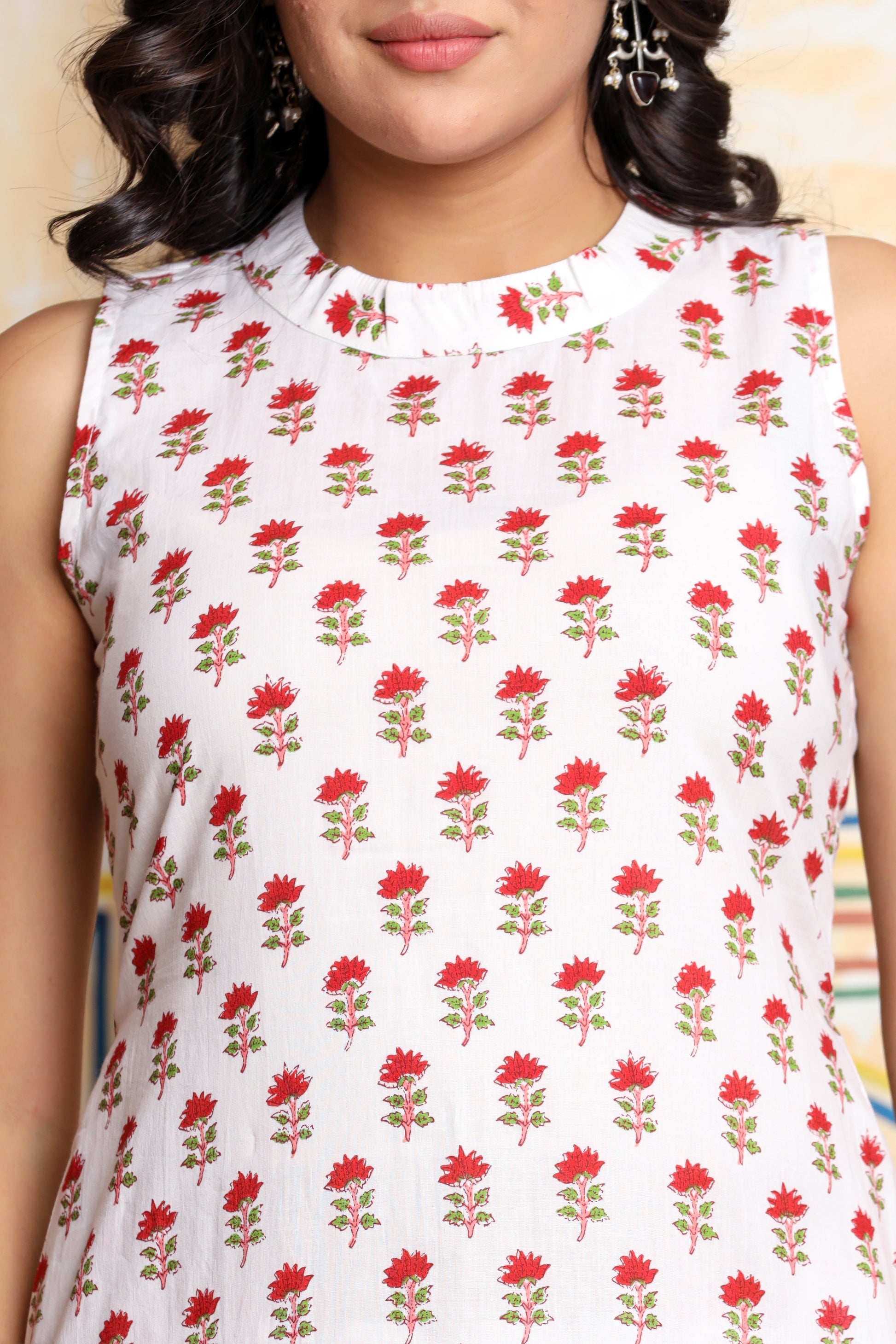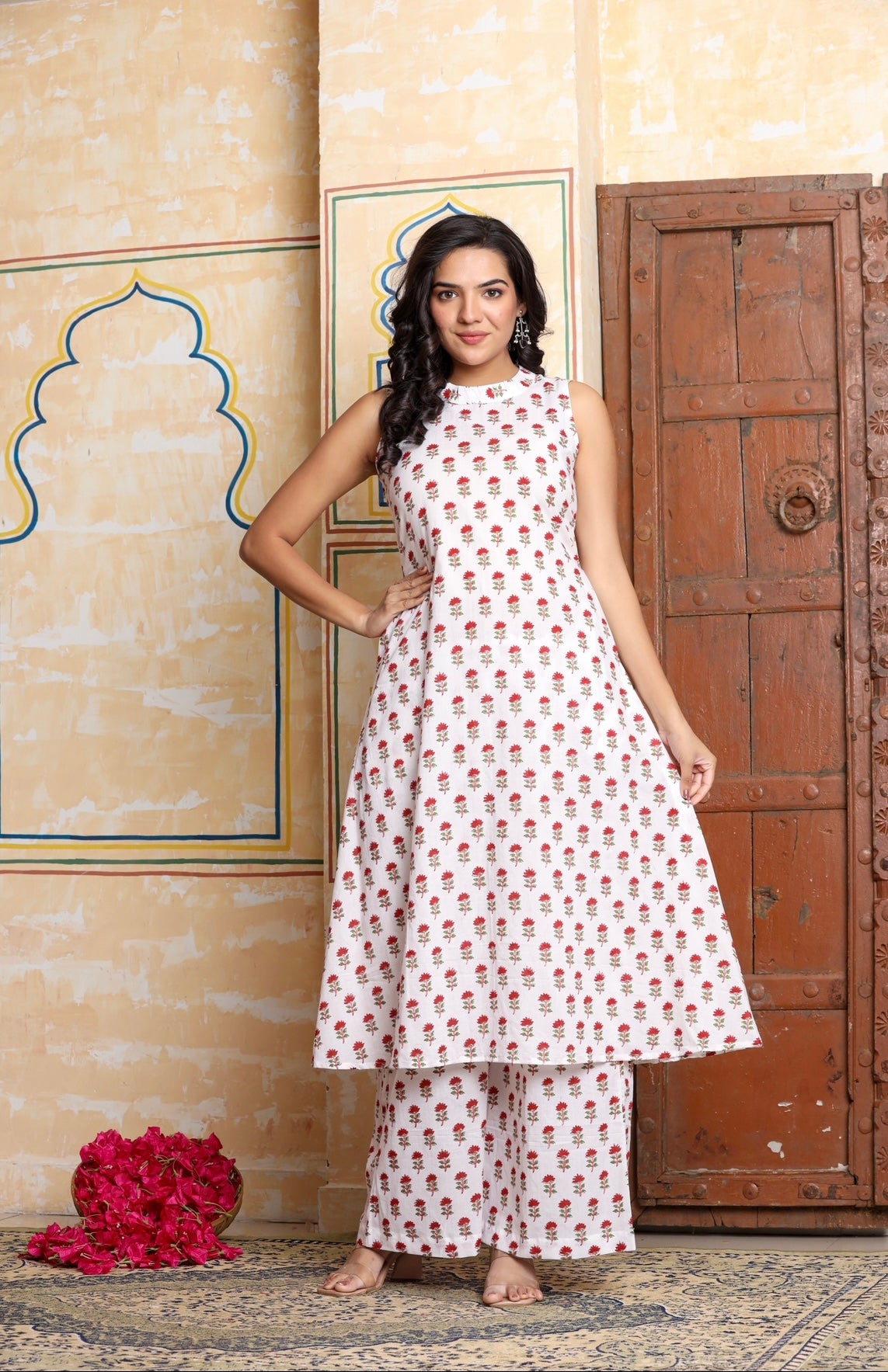 Add a splash of joy to your wardrobe with this cotton two piece cotton suit set by Sakhiyaan Jaipur. Crafted in soft, breathable cotton, this set features a floral print kurta design paired with matching pants. Making it perfect for both everyday wear. The rich play of colours brings alive a casual yet elegant charm while keeping you cool and comfortable all day long.