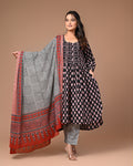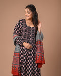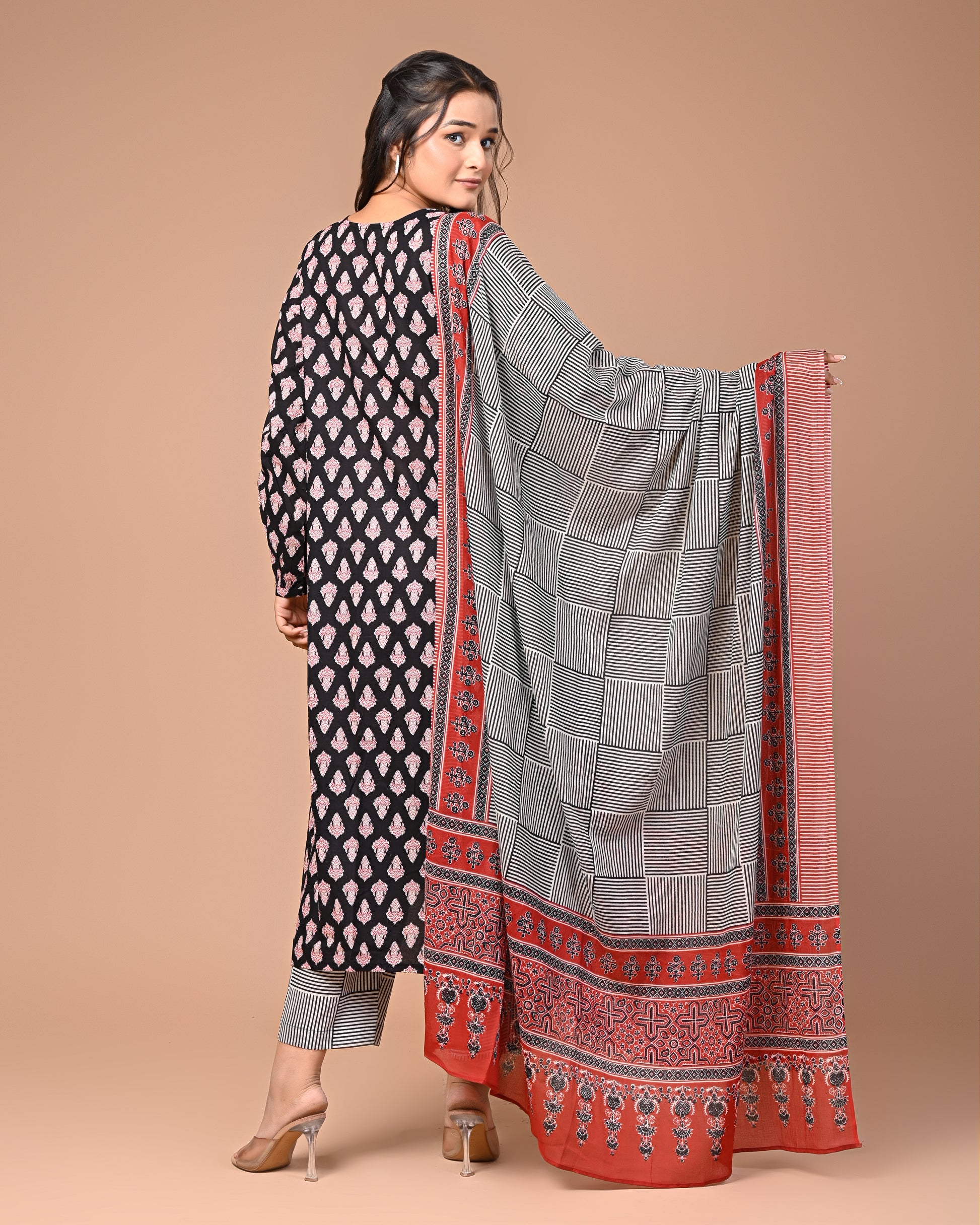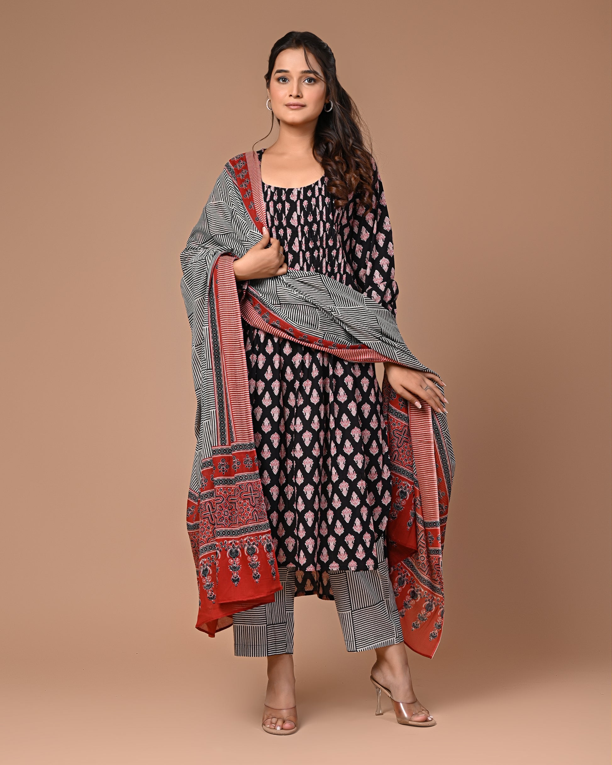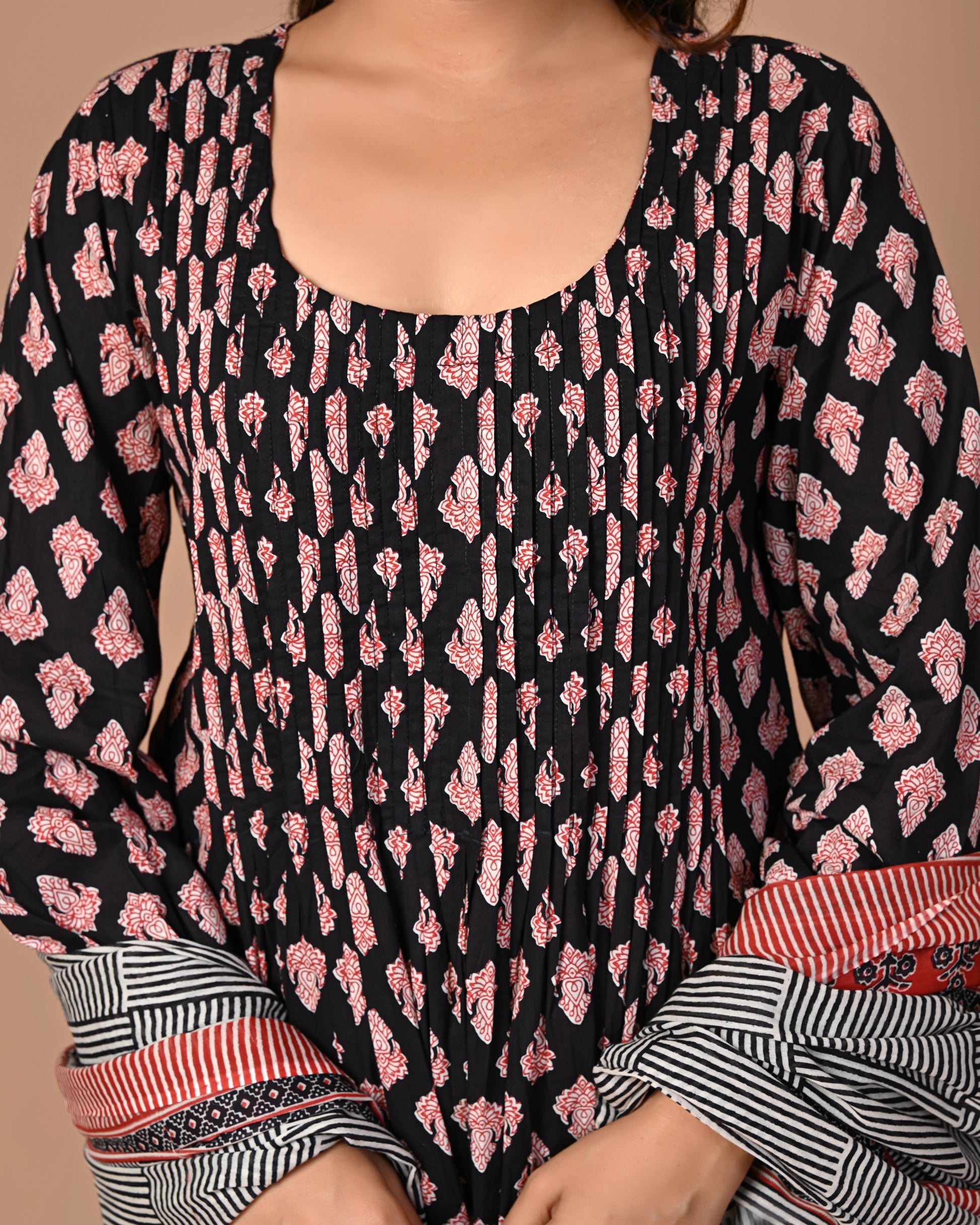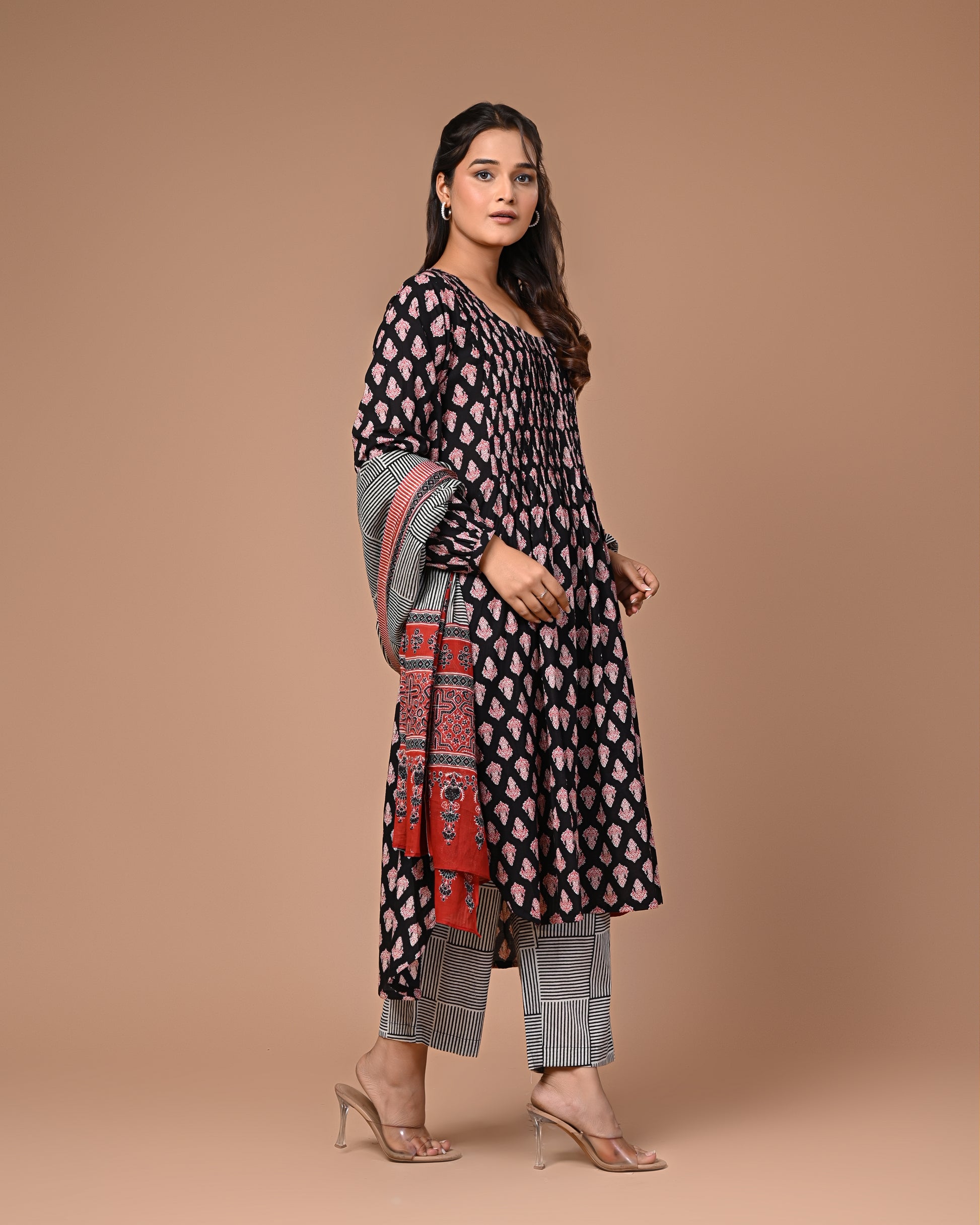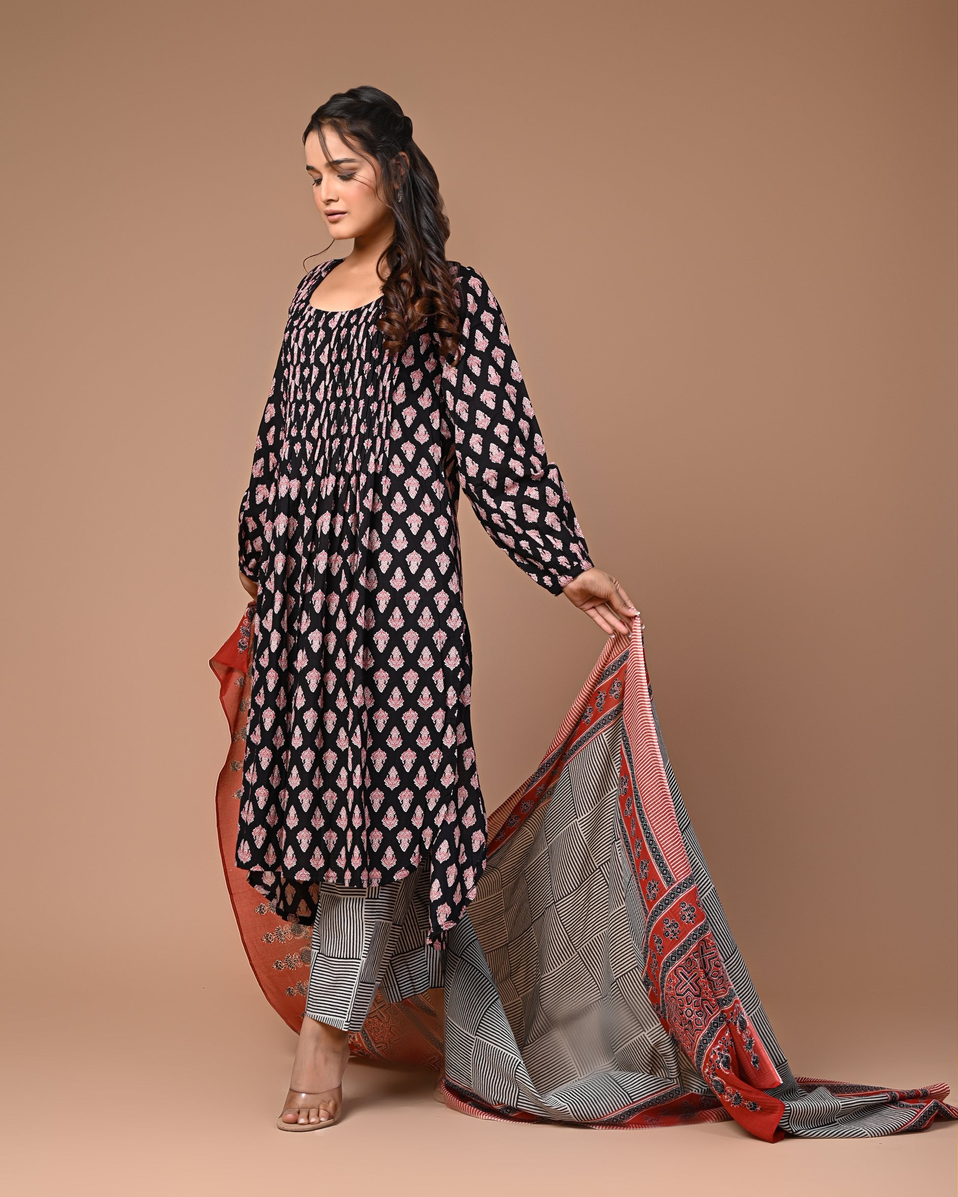 Our pintuck kurta set of three, adorned with delicate motif prints and full sleeves, brings a serene Sufi charm to your wardrobe. Blending ethnic elegance with a touch of modernity, this versatile ensemble is perfect for every occasion and flatters all body types and age groups.